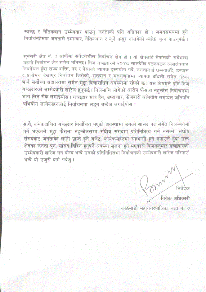 तर, उनको उम्मेदवारी खारेज गर्न माग गर्दै सोमवार काठमाडौं महानगरपालिका ७ का विवेक अधिकारीले निर्वाचन आयोगमा उजुरी दर्ता गरेका हुन् ।