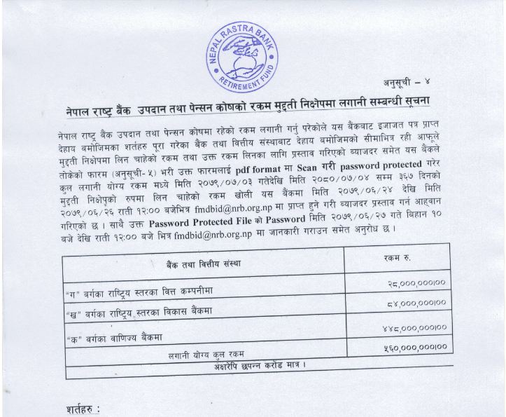 उपदान तथा पेन्सन कोषमा रहेको रकम तीन सय ६७ दिने मुद्धती निक्षेपकोरुपमा २०७९ कात्र्तिक तीन गतेदेखि २०८० कात्र्तिक चार गतेसम्मको लागि उक्त परिमाणमा रकम राख्न प्रस्ताव आव्हान गरिएको राष्ट्र बैंकले जानकारी दिएको छ । लगानीको लागि छु्ट्याईएको कुल रकम मध्ये वाणिज्य बैंकहरुको लागि ४४ करोड ८० लाख, विकास बैंकहरुको लागि आठ करोड ४० लाख र फाईनान्स कम्पनीहरुको लागि दुई करोड ८० लाख रुपैयाँ रहेको राष्ट्र बैंकको भनाइ छ ।
