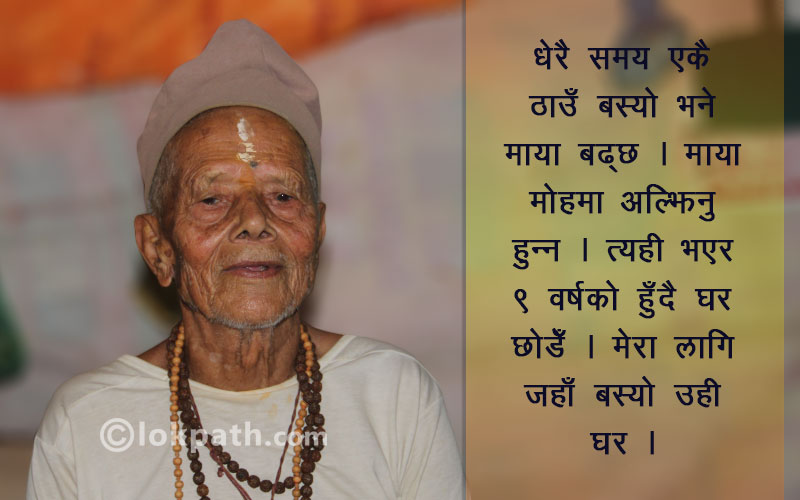 परिवारसँग बस्न मात्र होइन उनलाई धेरै समय एकै ठाउँ बस्न समेत मन लाग्दैन । भन्छन् ‘धेरै समय एकै ठाउँ बस्यो भने माया बढ्छ । माया मोहमा अल्झिनु हुन्न ।’ त्यसैले उनी ठाउँ ‘चेन्ज’ गरिरहन्छन् । दिल्ली, देवघाट हुँदै अहिले पशुपति । ‘यहाँबाट पनि हिँड्छु अब । धेर भो बसेको ।’ उनले यो कुरा यति सजिलै भने मानौं उनी २० वर्षका घुमन्ते लक्का जवान हुन् ।