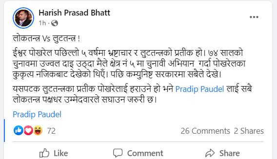 ‘लोकतन्त्र भर्सेज लुटतन्त्र। ईश्वर पोखरेल पछिल्लो ५ वर्षमा भ्रष्टाचार र लुटतन्त्रको प्रतीक हो। ७४ सालको चुनावमा उज्वल दाइ उठ्दा मैले क्षेत्र नं. ५ मा चुनावी अभियान गर्दा पोखरेलका कुकृत्य नजिकबाट देखेको थिएँ। पछि कम्युनिस्ट सरकारमा सबैले देखे,’ भट्टले लेखेका छन्, ‘यसपटक लुटतन्त्रका प्रतीक पोखरेलाई हराउने हो भने प्रदीप पौडेललाई सबै लोकतन्त्र पक्षधर उम्मेदवारले सघाउन जरुरी छ।’