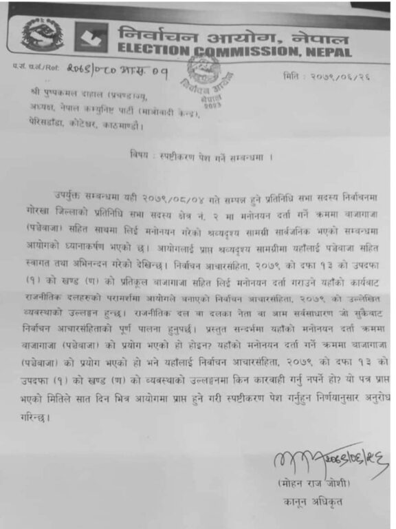 सामान्य तरिकाले तोकिएको संख्यामा मात्रै मनोनयनपत्र दर्ता गर्न जानुपर्नेमा तामझाम गरेको र बाजागाजा र तामझाम सहित मनोनयनपत्र दर्ता गराउन गएको भन्ने सूचना सञ्चारमाध्यम र सामाजिक सञ्जालबाट थाहा पाएको जनाउँदै निर्वाचन आयोगले ‘यो विषय सत्य हो कि होइन, हो भने तपाईंलाई किन कारबाही नगर्ने ?’ भनी स्पष्टीकरण सोध्नेको जनाएको छ ।