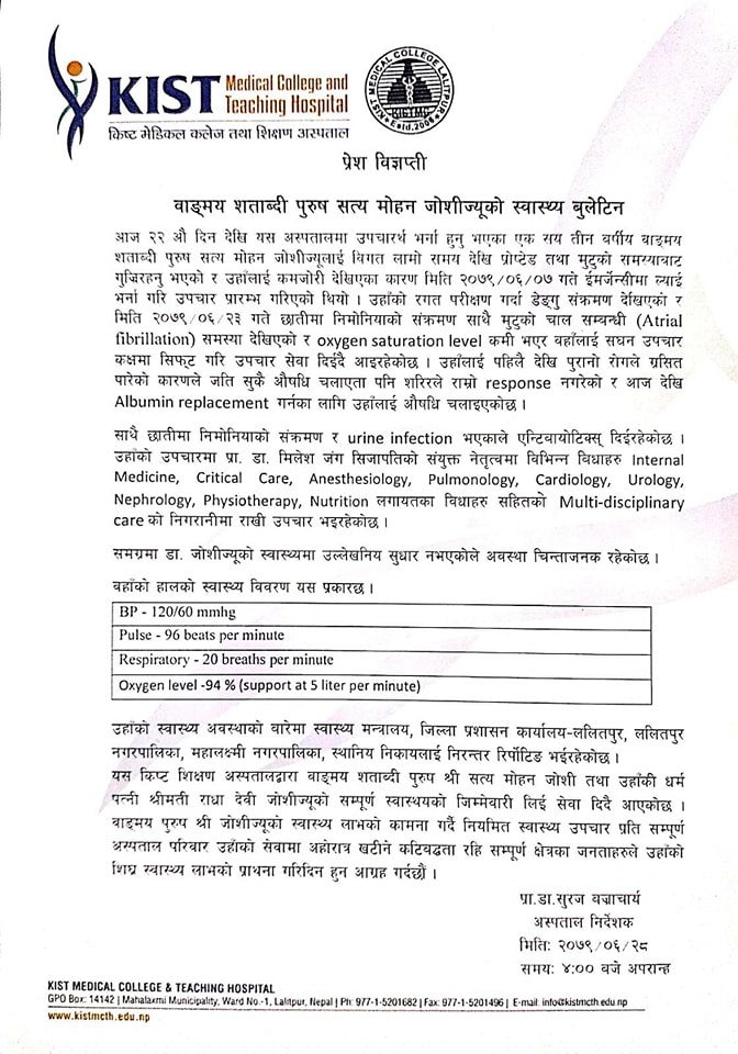 काठमाडौं । बिरामी भएर काठमाडौंको किष्ट मेडिकल कलेज एण्ड टिचिङ्ग हस्पिटलमा उपचार गराइरहेका वाङ्मय शताब्दी पुरुष सत्यमोहन जोशीको स्वास्थ्य अवस्था चिन्ताजनक भएको छ । आज हस्पिटलले एक बुलेटिन जारी गर्दै जोशीको स्वास्थ्य अवस्था बिग्रिएको बताएको हो ।