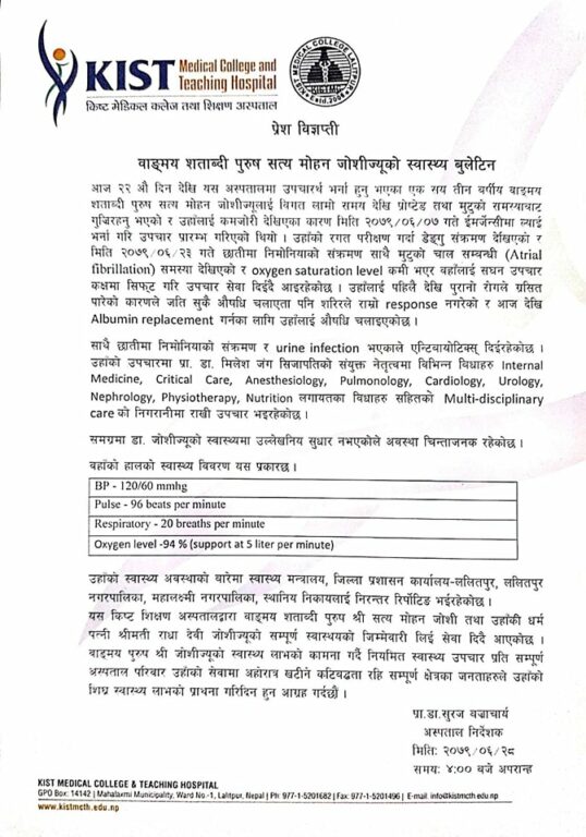 किस्ट अस्पतालले शुक्रबार बुलेटिन जारी गर्दै जशीको अवस्था चिन्ताजनक रहेको जनाएको हो । २२ दिनदेखि उपचाररत उनलाई बिहीबार आईसीयूमा सारेर उपचार थालिएको थियो । तर, औषधिले शरीरमा राम्रो काम नगरेको अस्पतालले निकालेको विज्ञप्तिमा उल्लेख छ ।