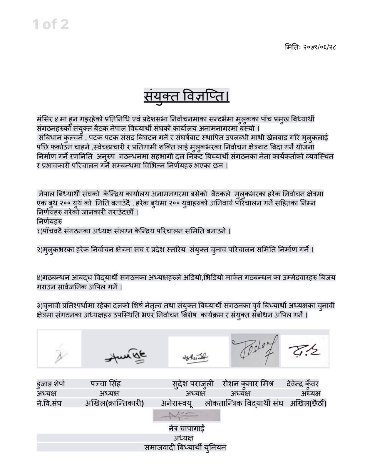 चुनावी प्रतिसर्धामा रहेका संयुक्त विद्यार्थी संगठनका पूर्व विद्यार्थी अध्यक्ष र दलका प्रत्येक शिर्ष नेतृत्वको चुनावी क्षेत्रमा संगठनका अध्यक्षहरु उपस्थिति भएर निर्वाचन विशेष कार्यक्रम र संयुक्त सम्बोधनको अपिलसमेत गर्ने पाँच विद्यार्थी संगठनले निर्णय गरेका छन् ।