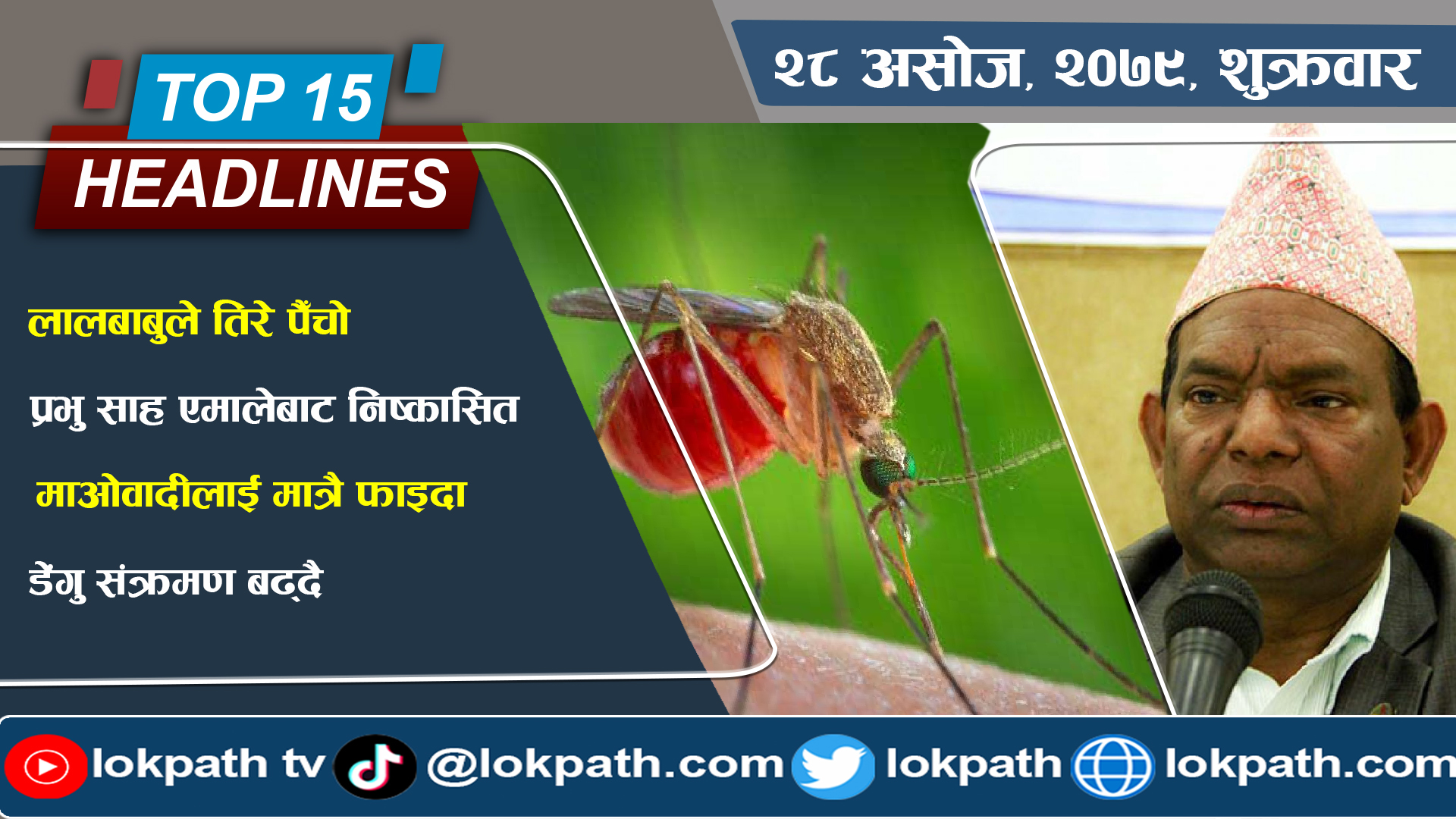 मनसुन सुरु भएपछिको एक सय दिने क्षति विवरण, इराकमा नयाँ राष्ट्रपतिको चयन र आजदेखि सुरु भएको नवौं राष्ट्रिय खेलकुदको उद्घाटनसम्बन्धी खबर पनि आजको टप फिप्टिन हेडलाइन्समा समावेश छन् ।