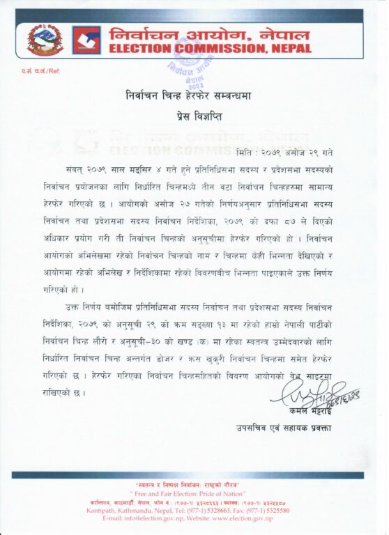 आयोगले शनिवार विज्ञप्ती जारी गर्दै ४ मंसिरमा हुने प्रतिनिधिसभा सदस्य र प्रदेशसभा सदस्यको निर्वाचन प्रयोजनका लागि निर्धारित चिन्हमध्ये तीन वटा निर्वाचन चिन्हमा सामान्य हेरफेर गरिएको जनाएको हो ।