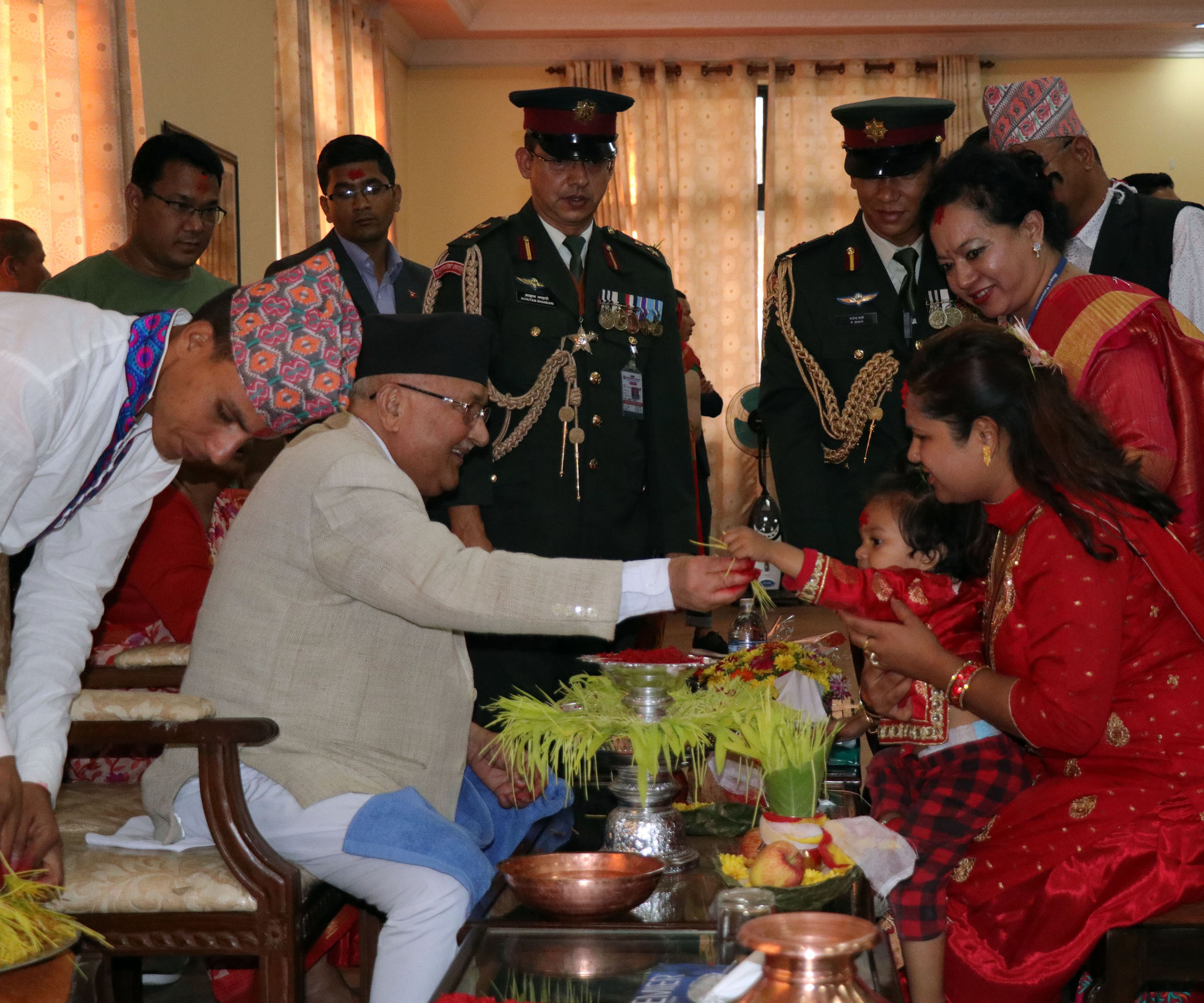 काठमाडौं । बडादशैँको अन्तिम दिन प्रधानमन्त्री केपी शर्मा ओलीको हातबाट आज विशिष्ट व्यक्तिदेखि सर्वसाधारणले टिका ग्रहण गरेका छन् ।