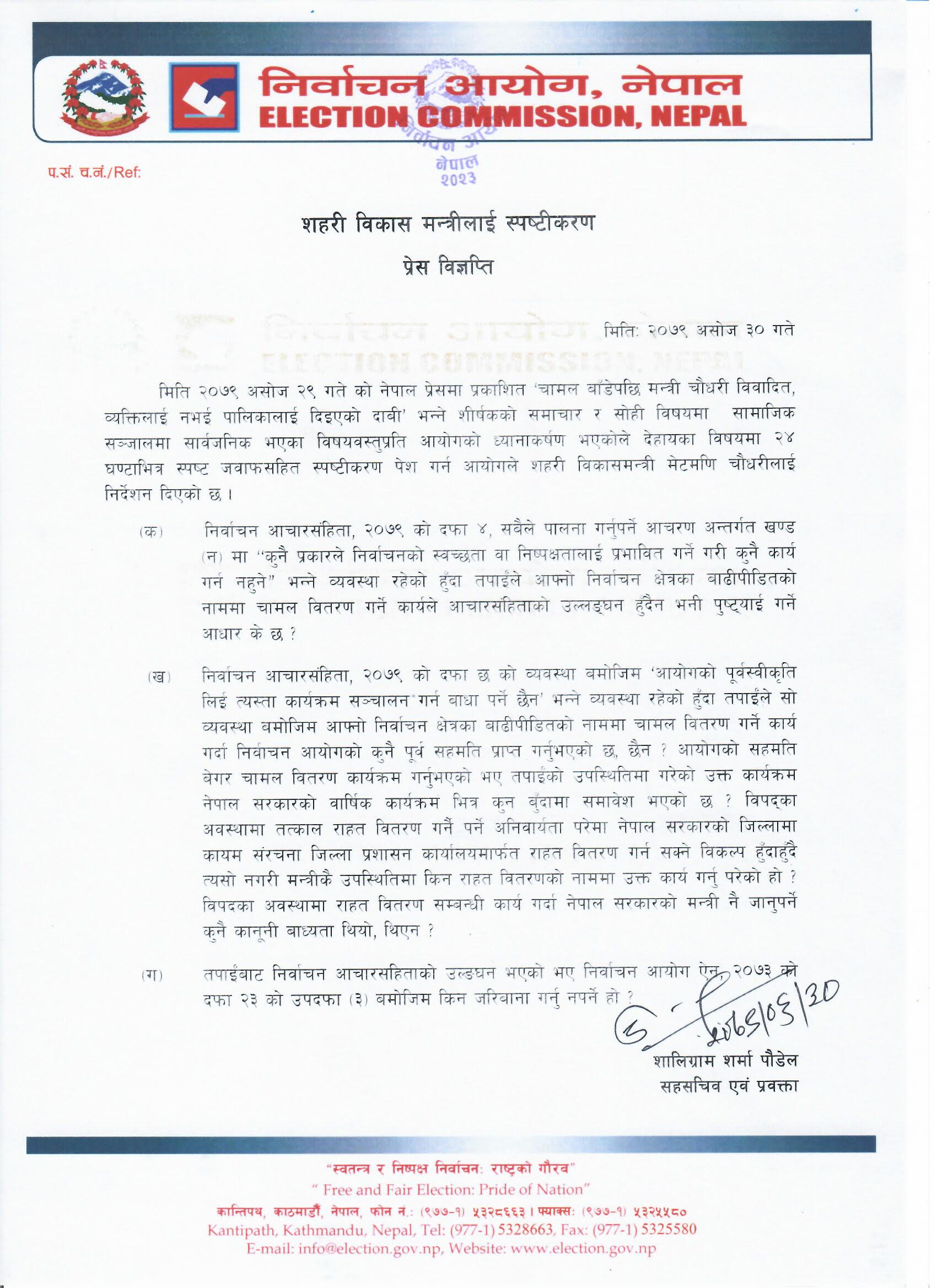 ‘निर्वाचन आचारसंहिता, २०७९ को दफा ४, सबैले पालना गर्नुपर्ने आचरण अन्तर्गत खण्ड (न) मा ‘कुनै प्रकारले निर्वाचनको स्वच्छता वा निष्पक्षतालाई प्रभावित गर्ने गरी कुनै कार्य गर्न नहुने’ भन्ने व्यवस्था रहेको हुँदा तपाईंले आफ्नो निर्वाचन क्षेत्रका बाढीपीडितको नाममा चामल वितरण गर्ने कार्यले आचारसंहिताको उल्लङ्घन हुँदैन भनी पुष्ट्याई गर्ने आधार के छ ?,’ आयोगले मन्त्री चौधरीलाई सोधेको छ ।