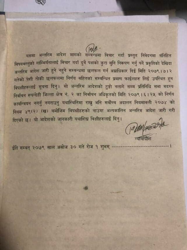 सो अन्तरिम आदेशको टुंगो नलागेसम्म प्रतिनिधिसभा सदस्य निर्वाचन रुपन्देही जिल्ला क्षेत्र नं २ का निर्वाचन अधिकृतको निर्णय कार्यान्वयन नगर्नु नगराउन सर्वोच्चले आदेश दिएको हो ।