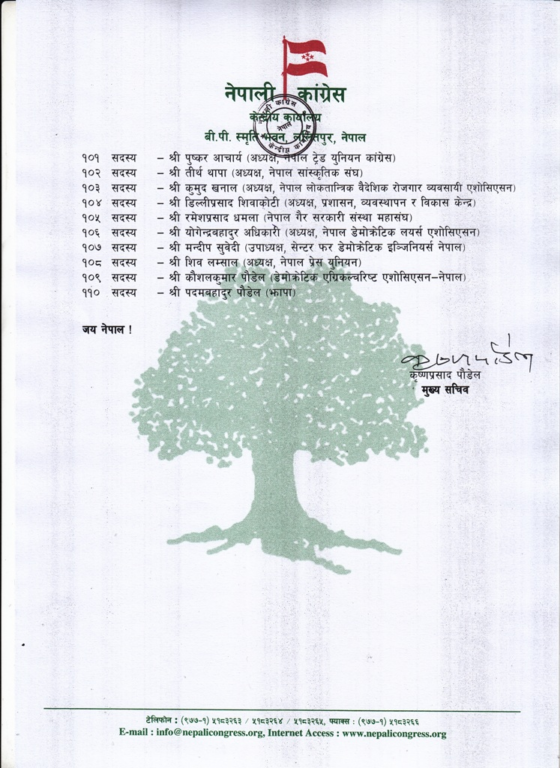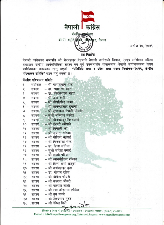 पार्टीका सभापति शेरबहादुर देउवाले नेपाली कांग्रेसको विधान, २०१७ (संशोधनसहित) बमोजिम केन्द्रीय कार्यसमितिका सदस्य एवं पूर्व उपसभापति गोपालमान श्रेष्ठको संयोजकत्वमा केन्द्रीय परिचालन समिति गठन गरेका हुन् ।
