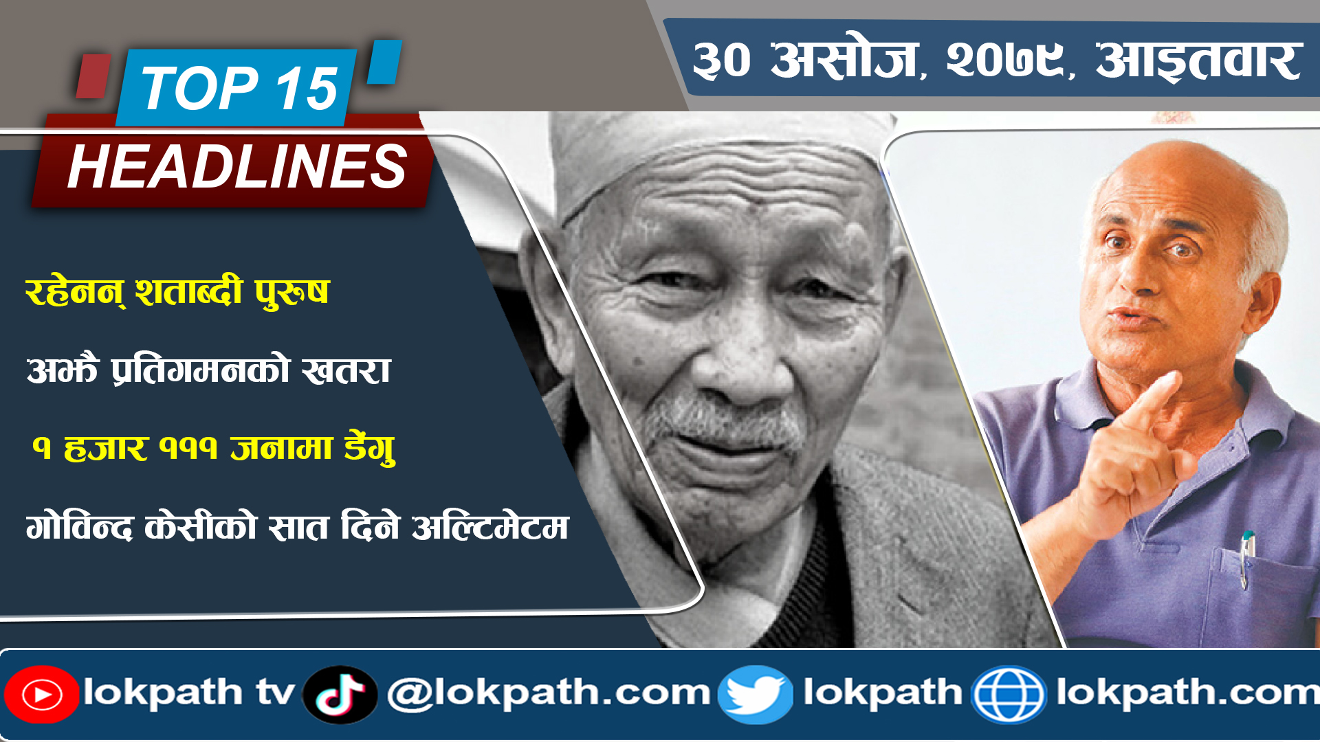 त्यस्तै, सरकारलाई डा.गोविन्द केसीको सातदिने अल्टिमेटम, टर्कीमा भएको खानीविस्फोट तथा नवौं राष्ट्रिय खेलकुदसम्बन्धी अपडेट आजको टप फिप्टिनमा समावेश छन् ।