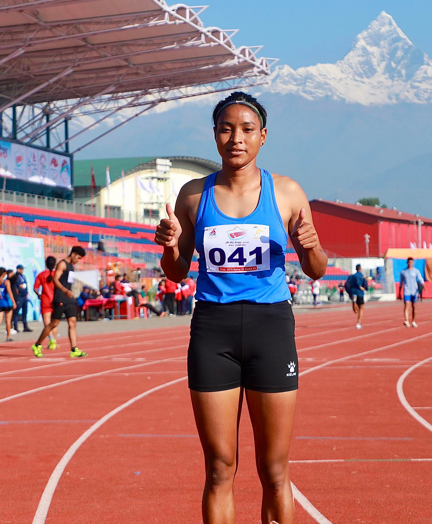 काठमाडौं । नवौं बृहत राष्ट्रिय खेलकुदअन्तर्गत एथलेटिक्स ४ सय मिटर दौडमा एपिएफकी रमिताकुमारी थारुले राष्ट्रिय कीर्तिमानसहित स्वर्ण पदक जितेकी छिन् ।