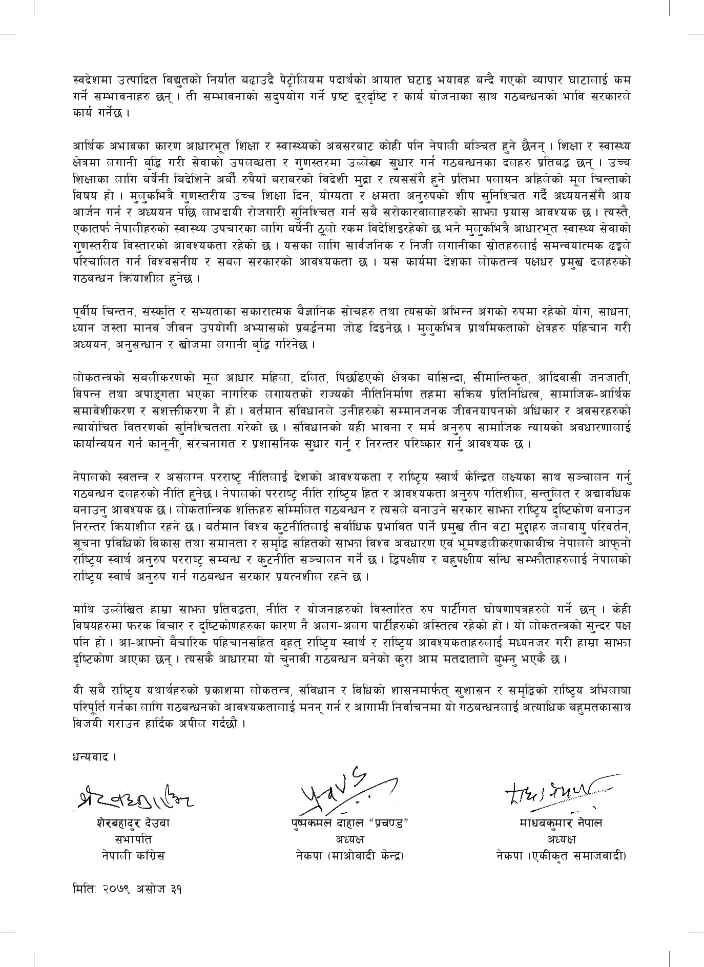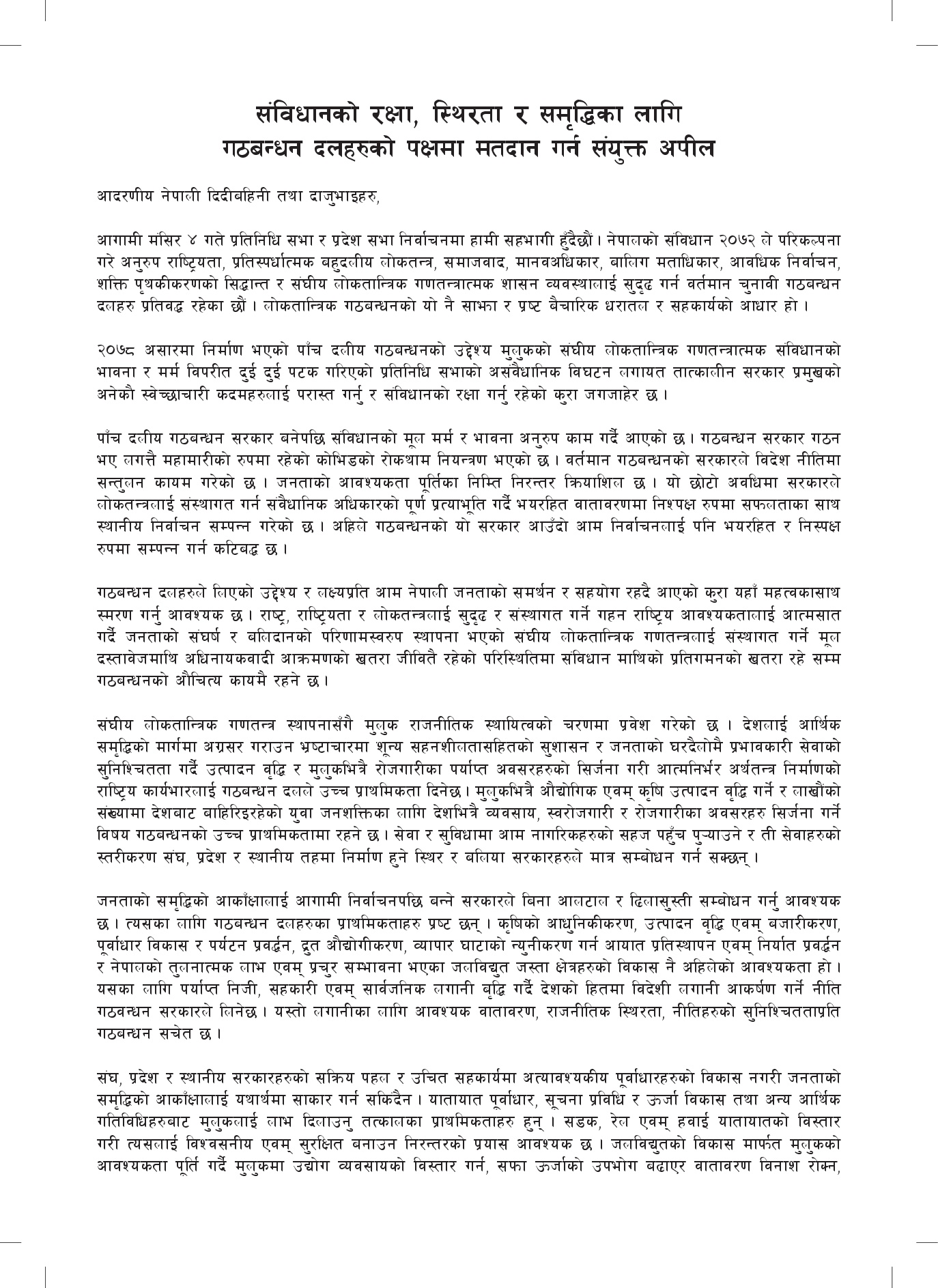 काठमाडौं । सत्ता गठबन्धनले आज जारी गरेको संयुक्त अपीलमा राष्ट्रिय जनममोर्चाको भने हस्ताक्षर छैन । देशमा स्थिरता, विकास समृद्धिका गठबन्धनमा आवद्ध दलहरूलाई मतदान गर्न गठबन्धनले जारी गरेको विज्ञप्तीमा नेपाली कांग्रेसका सभापति शेरबहादुर देउवा, माओवादी केन्द्रका अध्यक्ष पुष्पकमल दाहाल प्रचण्ड र नेकपा एसका अध्यक्ष माधवकुमार नेपालको मात्रै हस्ताक्षर छ ।