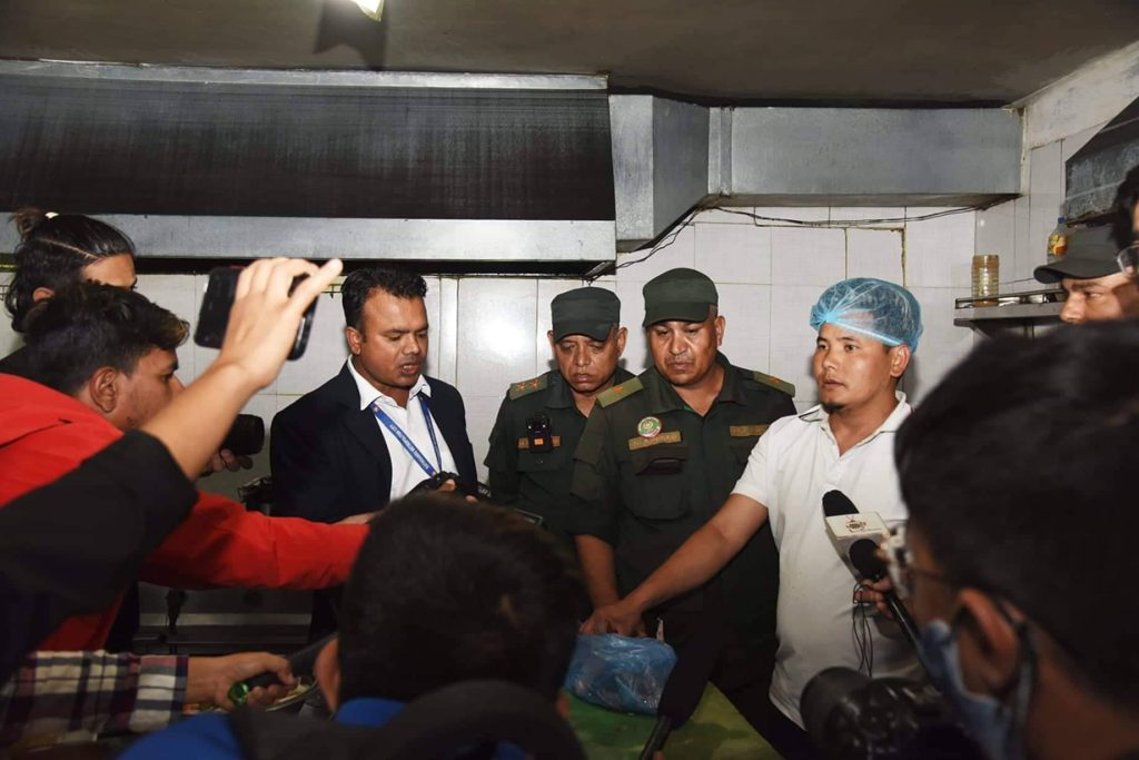 यसरी उपभोक्ताको स्वास्थ्यमा प्रत्यक्ष नकारात्मक असर पुग्ने गरी व्यवसाय सञ्चालन गर्ने होटल तथा मिठाइ पसल सञ्चालकलाई ३ दिनभित्र कार्यालयमा हाजिर हुन भनिएको छ । निरीक्षण अधिकृत एवं खाद्य पदार्थ गुणस्तर नियमन तथा पशुपंक्षी महाशाखा प्रमुख डा.अवधेश झाले भने, ‘बर्गर हाउसको फ्रिजमा खान नमिल्ने मासु भेटियो । व्यवसायी आफूले मासु उत्पादन नगर्ने र आपूर्तिकर्ताबाट प्राप्त गर्ने भनेपछि आपूर्तिकर्तालाई लिएर ३ दिनभित्र कार्यालयमा उपस्थित आदेश जारी गरिएको फारम दिइएको छ । थकाली भान्छा घरको किचनमा खाना पकाउने ठाउँमै बसेर खाना खाइरहेको भेटियो । यसरी हेर्दा सामान व्यवस्थापन, पकाउने तथा भण्डारण गर्ने पद्धति र खाना तयारीसँग सम्बन्धित व्यक्तिहरुको आचरणमा सुधार गर्नुपर्ने देखिन्छ ।’