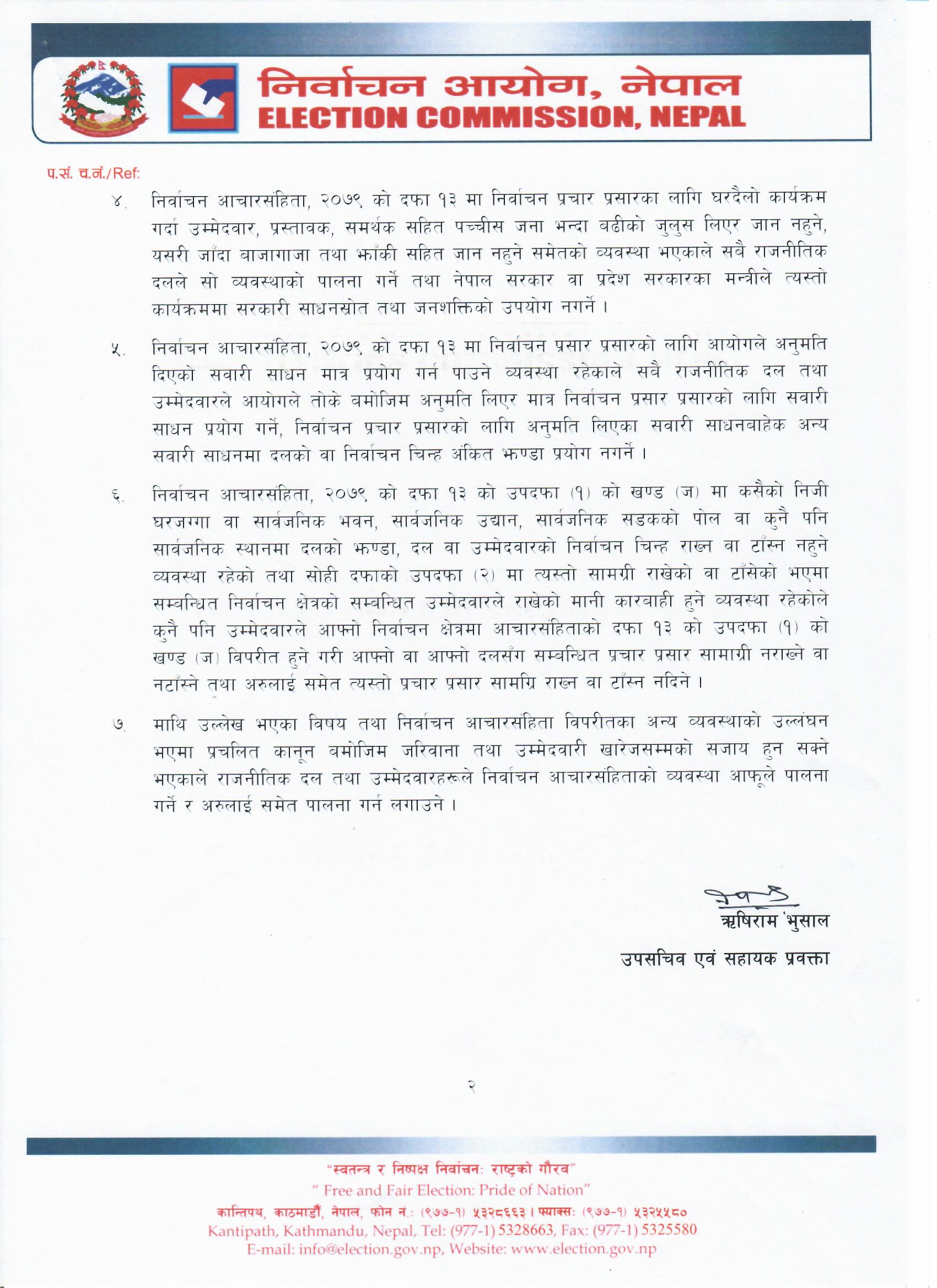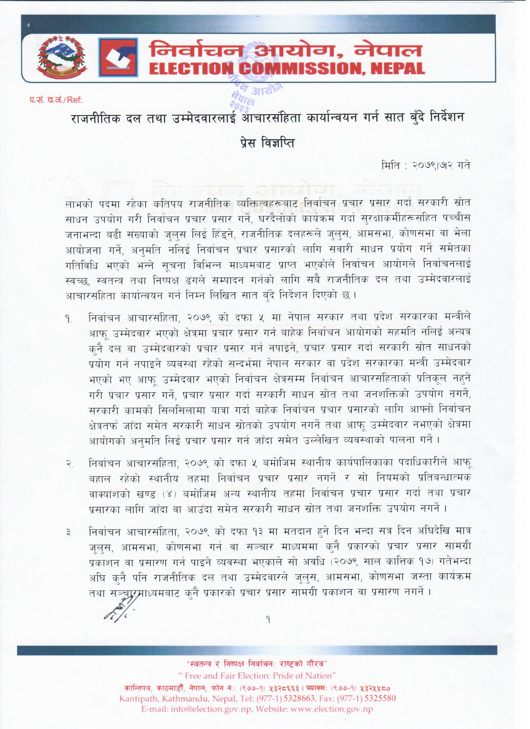 ‘लाभको पदमा रहेका कतिपय राजनीतिक व्यक्तित्वहरूबाट निर्वाचन प्रचार प्रसार गर्दा सरकारी स्रोत साधन उपयोग गरी निर्वाचन प्रचार प्रसार गर्ने, घरदैलोको कार्यक्रम गर्दा सुरक्षाकर्मीहरूसहित पच्चीस जनाभन्दा बढी संख्याको जुलुस लिई हिँड्ने, राजनीतिक दलहरूले जुलुस, आमसभा, कोणसभा वा भेला आयोजना गर्ने, अनुमति नलिई निर्वाचन प्रचार प्रसारको लागि सवारी साधन प्रयोग गर्ने समेतका गतिविधि भएको भन्ने सूचना विभिन्न माध्यमबाट प्राप्त भएकोले निर्वाचन आयोगले निर्वाचनलाई स्वच्छ, स्वतन्त्र तथा निष्पक्ष ढंगले सम्पादन गर्नको लागि सबै राजनीतिक दल तथा उम्मेदवारलाई आचारसंहिता कार्यान्वयन गर्न निम्न लिखित सात बुँदे निर्देशन दिएको छ ।’ जारी विज्ञप्तिमा भनिएको छ ।