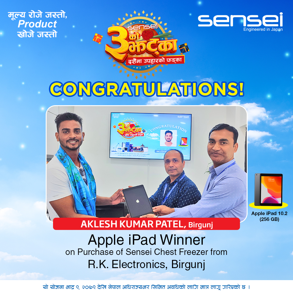 काठमाडौं । सेन्साई ३ को झट्का योजना अन्र्तगत पहिलो विजेता घोषणा गरिएको छ । जापानमा ईन्जिनियरिङ गरिएको नेपाली इलेक्ट्रोनिक्स ब्राण्ड सेन्साईले नेपालीहरुको चाड दसैँ तिहार २०७९ लाई लक्षित गर्दै सार्वजनिक गरिएको योजनाका पहिलो विजेता सावर्जनिक गरिएको हो ।