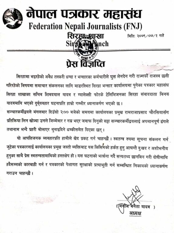 सिरहा। पत्रकार महासंघले भन्सार कार्यालय माडरमा पत्रकार महासंघ सिरहाका सचिव शिवदयाल यादव र ग्यालेक्सी फोकेका सिरहा संवाददाता विनय यादवमाथि भएको दुर्व्यवहार घटनाप्रति आपत्ति जनाएको छ । पत्रकार महासंघ सिरहाका अध्यक्ष मनोज बनैताले बुधबार विज्ञप्ति जारी गर्दै सञ्चारकर्मी दुर्व्यवहार घटनाप्रति खेद प्रकट गरेका हुन् ।
