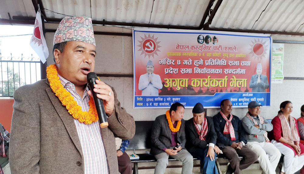 नेकपा एमाले सूर्यविनायक नगरपालिका ७ गुण्डूले आज आयोजना गरेको मंसिर ४ गते हुने प्रतिनिधिसभा र प्रदेशसभा निर्वाचनको सन्दर्भमा आयोजित अगुवा कार्यकर्ता भेलालाई सम्बोधन गर्दै उनले वर्तमान कांग्रेस नेतृत्वको गठबन्धनको सरकार बनेसँगै अर्थतन्त्र टाट पल्टिने अवस्थामा पुगेको उल्लेख गरे ।