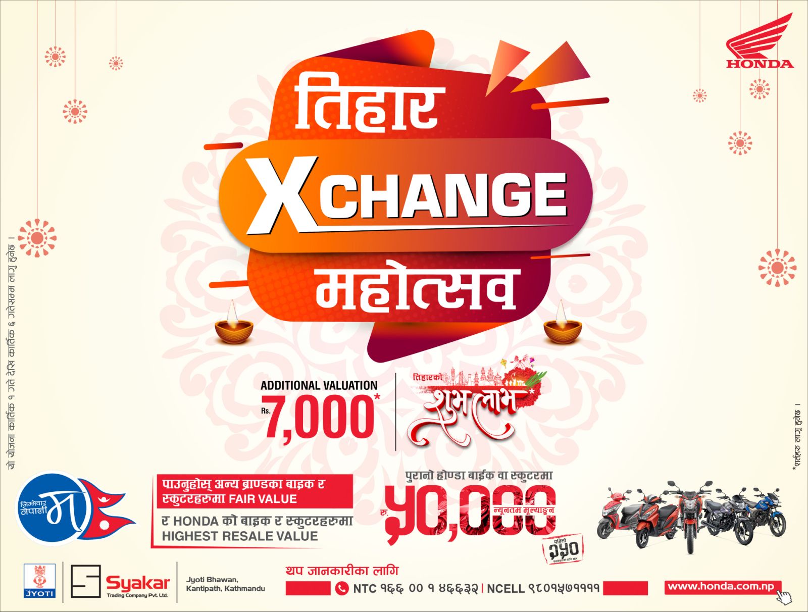 यो योजना अन्तर्गत ग्राहकहरूले, प्रत्येक एक्सचेन्जमा थप सात हजार वा दसैँ तथा तिहार योजना रोज्न सक्ने छन् । त्यसैगरी, होन्डाका पहिलो दुई सय ५० ग्राहकहरूले एक्सचेन्जको न्यूनतम मूल्यांकन ५० हजार रुपैयाँ पाउनेछन् ।