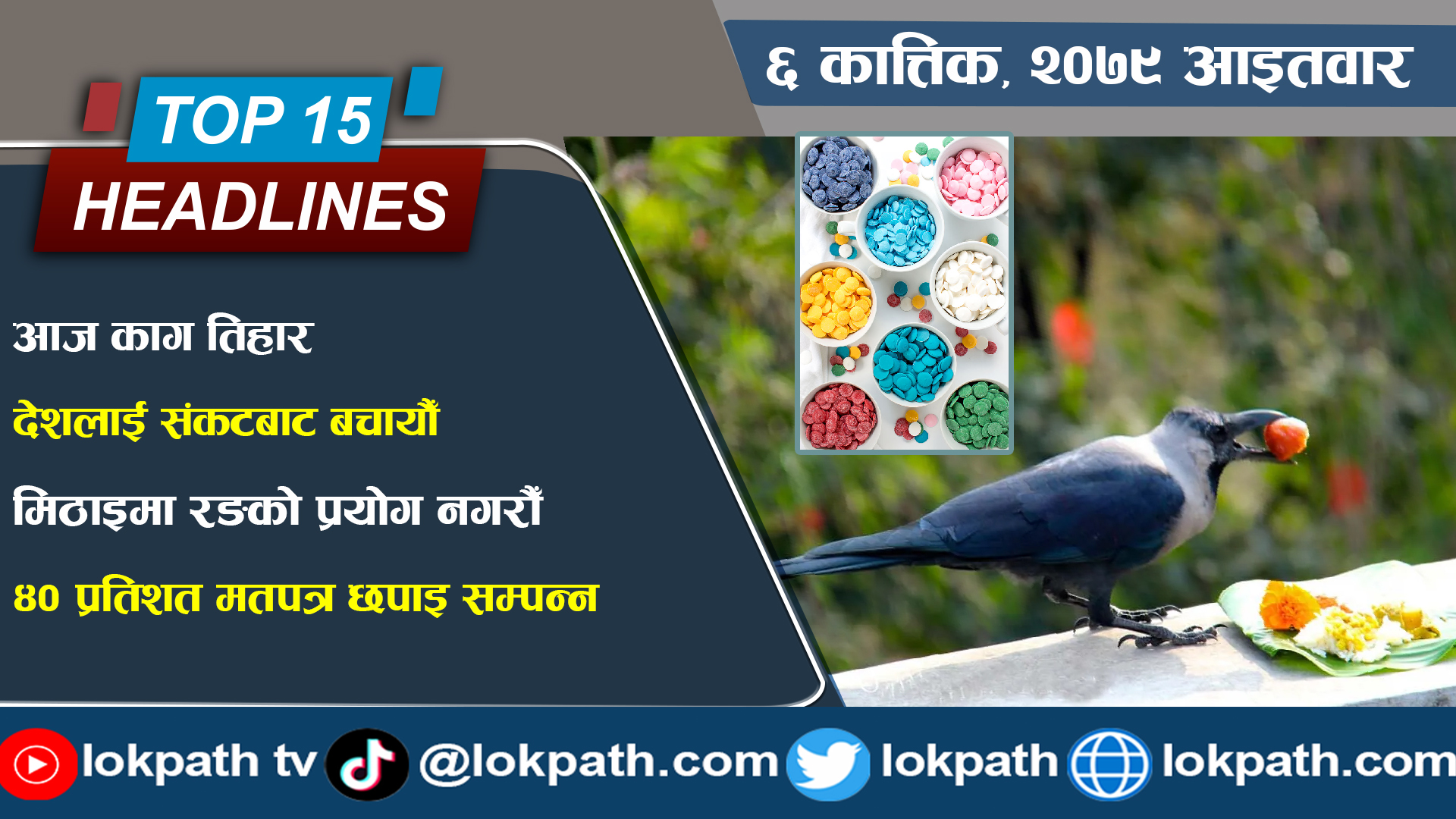 १. आजबाट हिन्दू धर्मावलम्बीहरुको दोस्रो महान चाड तिहार सुरु, आज पहिलो दिन काग तिहार धार्मिक विधिपूर्वक कागको पूजा गरि मनाइयो ।