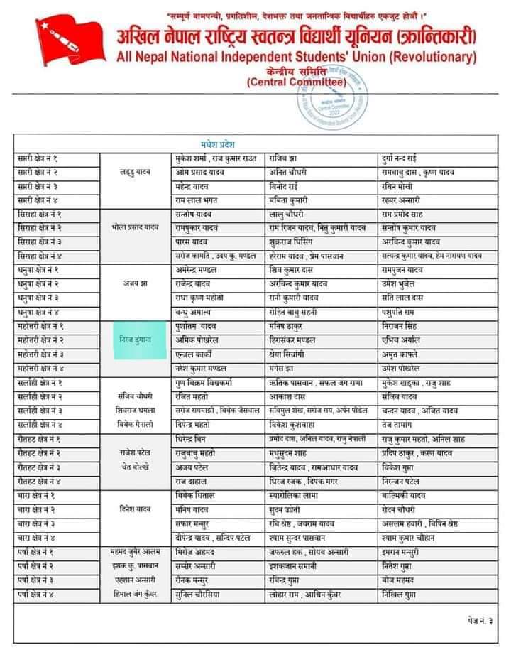 महोत्तरीमा नीरज ढुंगाना, धनुषामा अजय झा, सिरहामा भोलाप्रसाद यादव, सप्तरीमा लड्डु यादव, सर्लाहीमा सञ्जीव चौधरी, शिवराज धमला र विवेक मैनाली, बारामा दिनेश यादव, पर्सामा महम्मद जुवेर आलम, ईशक कुमार पासमान, एहसान अनसारी र हिमालजङग कुवर, रौतहटमा राकेश पटेल र चेत बोत्खेलाई तोकिएको अनेरास्ववियु क्रान्तिकारीको केन्द्रीय कार्यालयले जनाएको छ ।
