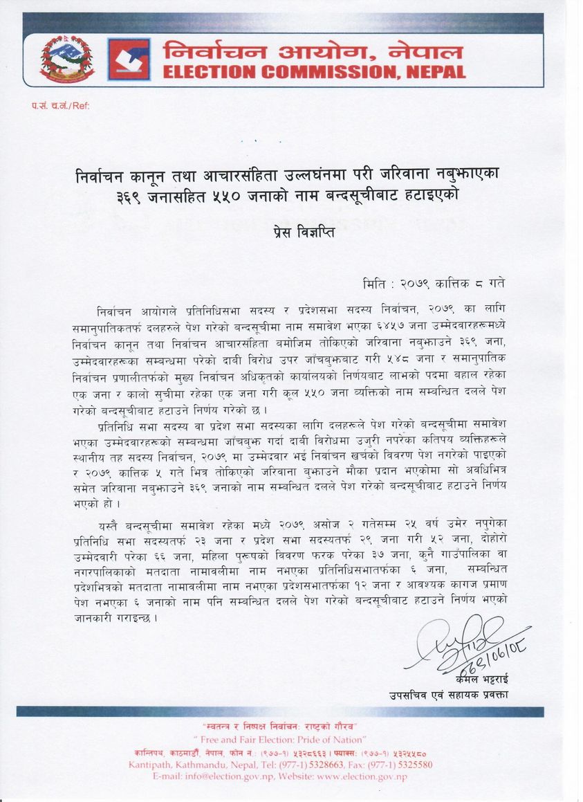 प्रतिनिधि सभातर्फ दलहरुले पेश गरेको बन्दसूचीमा समावेश भएका ६ हजार ४५७ जना उम्मेदवारहरुमध्ये निर्वाचन कानुन तथा निर्वाचन आचारसंहिता बमोजिम तोकिएको जरिवाना नबुझाउने ३६९ जना, उम्मेदवारहरुका सम्बन्धमा परेको दाबी विरोध उपर जाँचबुझबाट गरी ५४८ जना र समानुपातिक निर्वाचन प्रणालीतर्फको मुख्य निर्वाचन अधिृतको कार्यालयको निर्णयबाट लाभको पदमा बहाल रहेका एक जना र कालोसूचीमा रहेका एक जना गरी कूल ५५० जनाको नाम सम्बन्धित दलले पेश गरेको बन्दसूचीबाट हटाउने निर्णय गरेको आयोगले जारी गरेको सूचनामा उल्लेख गरिएको छ ।