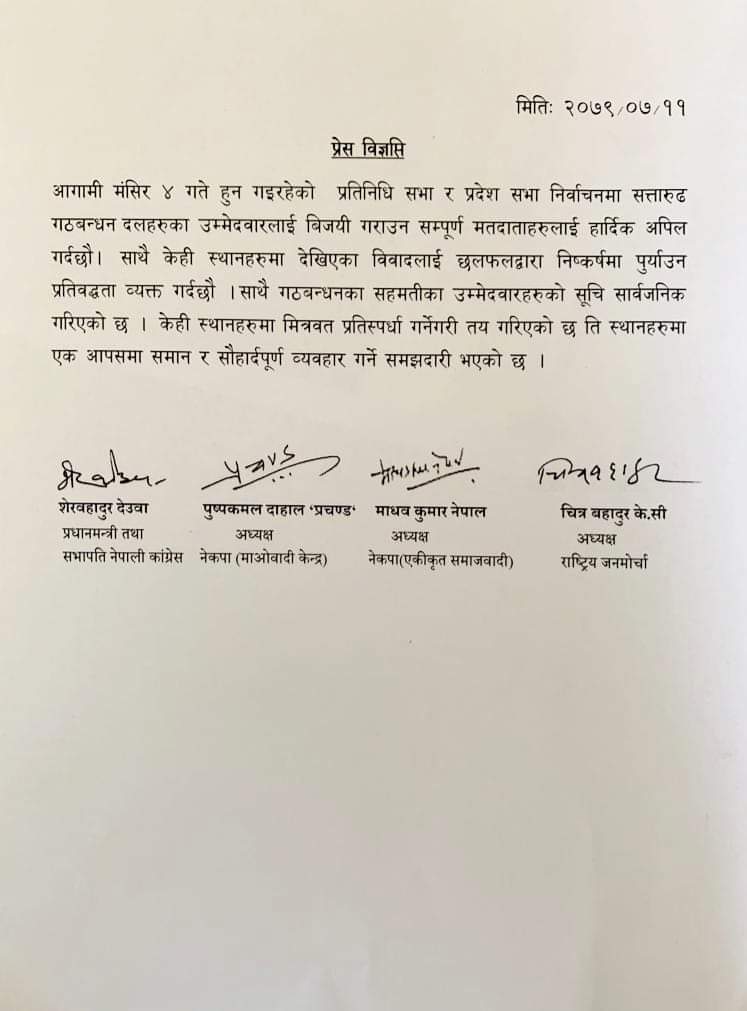 गठबन्धनमा आबद्ध दलका तर्फबाट आज जारी गरिएको संयुक्त विज्ञप्तिमा गठबन्धन दलका उम्मेदवारलाई विजयी गराउन मतदातालाई अपिल गरिएको छ ।