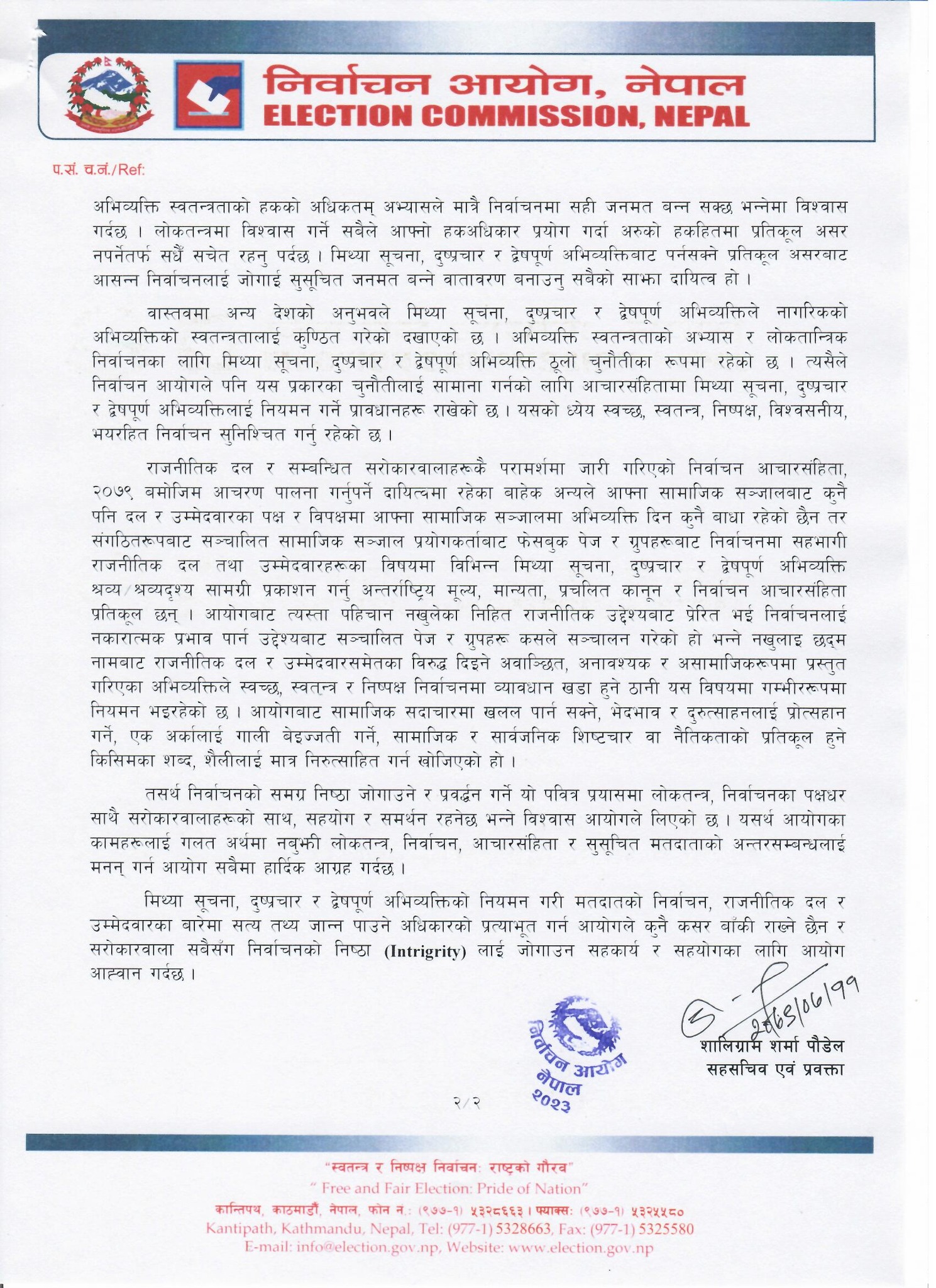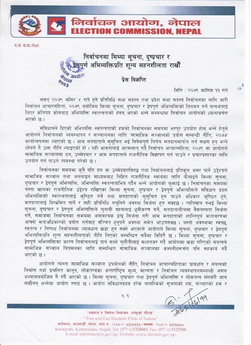 काठमाडौं । निर्वाचन आयोग नेपालले आगामी निर्वाचन मिथ्या सूचना, दुष्प्रचार र द्वेषपूर्ण अभिव्यक्तिप्रीत शून्य सहनशीलता राख्न आह्वान गरेको छ ।