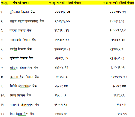 गत आर्थिक वर्षको सोही अवधिमा यि बैंकहरुको यस्तो नाफा पाँच करोड ४४ लाख ३१ हजार र १७ रकोड ५७ लाख ४७ हजार रुपैयाँ रहेको थियो । यसैगरी मितेरी र सिन्धु विकास बैंकले पनि चालु आर्थिक वर्षको पहिलो त्रैमासमा क्रमशः तीन करोड ६६ लाख २२ हजार र २१ लाख ५८ हजार रुपैयाँ खुद मुनाफा कमाएका छन् । गत आर्थिक वर्षको सोही अवधिमा भने मितेरीको नाफा तीन करोड ६२ लाख दुई हजार रुपैयाँ रहेको थियो भने सिन्धुको नाफा ६६ लाख ६९ हजार रुपैयाँले ऋणात्मक रहेको थियो । चालु आर्थिक वर्षको पहिलो त्रैमासमा नारायणी डेभलपमेन्ट र ग्रीन डेभलपमेन्ट बैंकले भने क्रमशः एक करोड ६७ लाख एक हजार र एक करोड ७८ लाख ३६ हजार रुपैयाँले खुद नोक्सानी बेहोरेका छन् ।