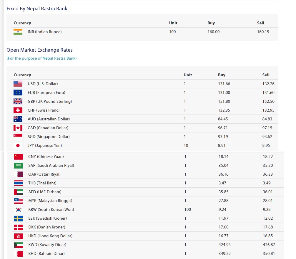 आज डलरको खरिद दर १३१ रुपैयाँ ६६ पैसा र बिक्री दर १३२ रुपैयाँ २६ पैसा रहेको छ । युरो एकको खरिद दर १३१ रुपैयाँ ०० पैसा र बिक्री दर १३१ रुपैयाँ ६० पैसा रहेको छ ।