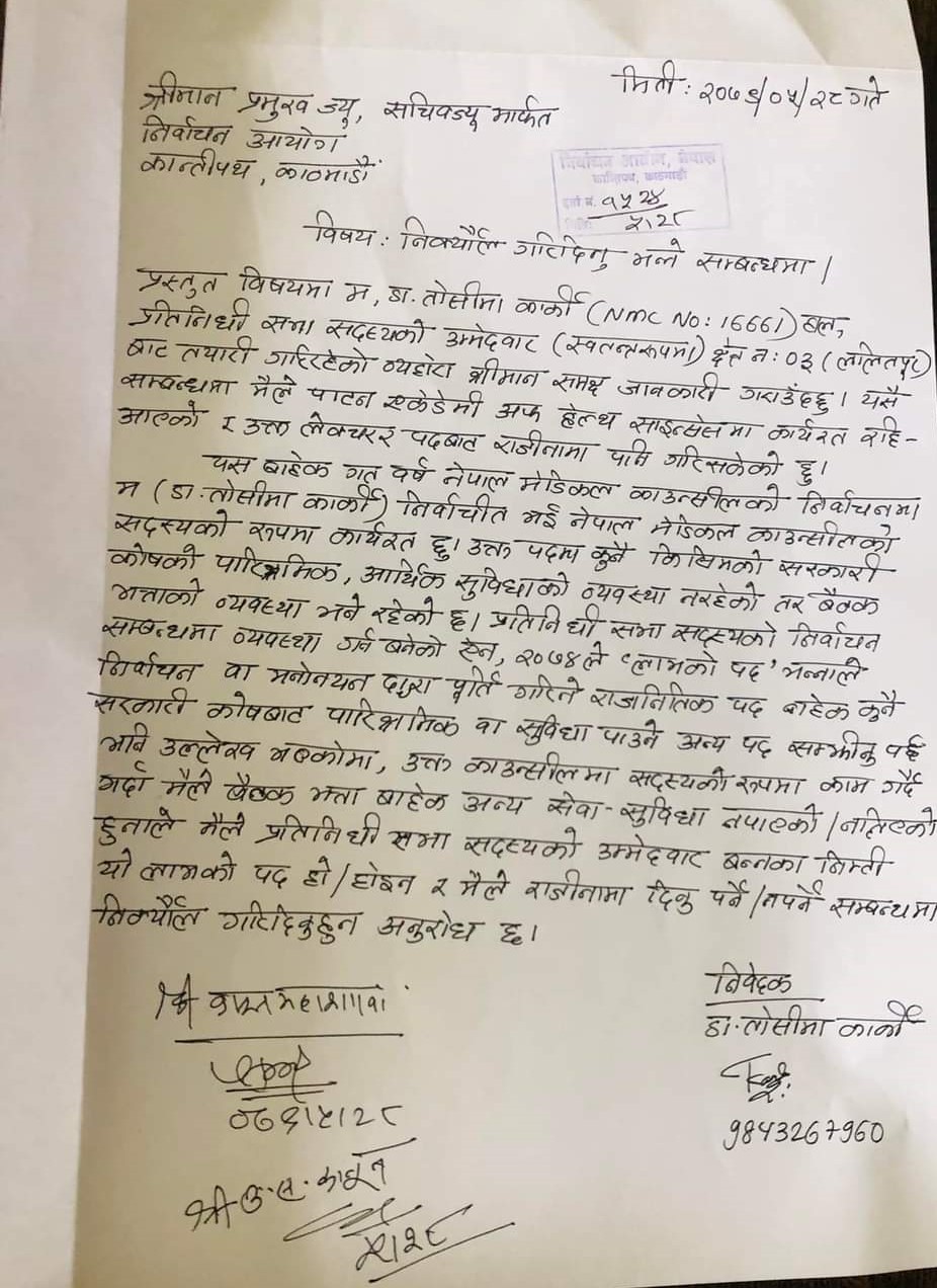 २०७९–०५–२८ मितिमा (मनोनयनको २५ दिन अगाडी नै) निर्वाचन आयोगको कार्यालयमा पत्र लेखेर नेपाल मेडिकल काउन्सिलको सो पद लाभको पद हुने वा नहुने बारेमा स्पष्ट पारिदिन निवेदन समेत दिएको थिएँ (तस्विरमा पढ्नुहोस्) तर निर्वाचन आयोगले सो निवेदनलाई जवाफ दिन आवश्यक पनि मानेन । यसैले कानुनमा जरुरी नभएको तथा ४ हजार जति सदस्यहरुको मतले नीतिनिर्माणमा पुगेकोले ति मतहरुलाई घात नगर्न पनि मैले नेपाल मेडिकल काउन्सिलको सदस्य पदबाट राजिनामा दिन हुन्न भन्ने मेरो निष्कर्ष रह्यो ।