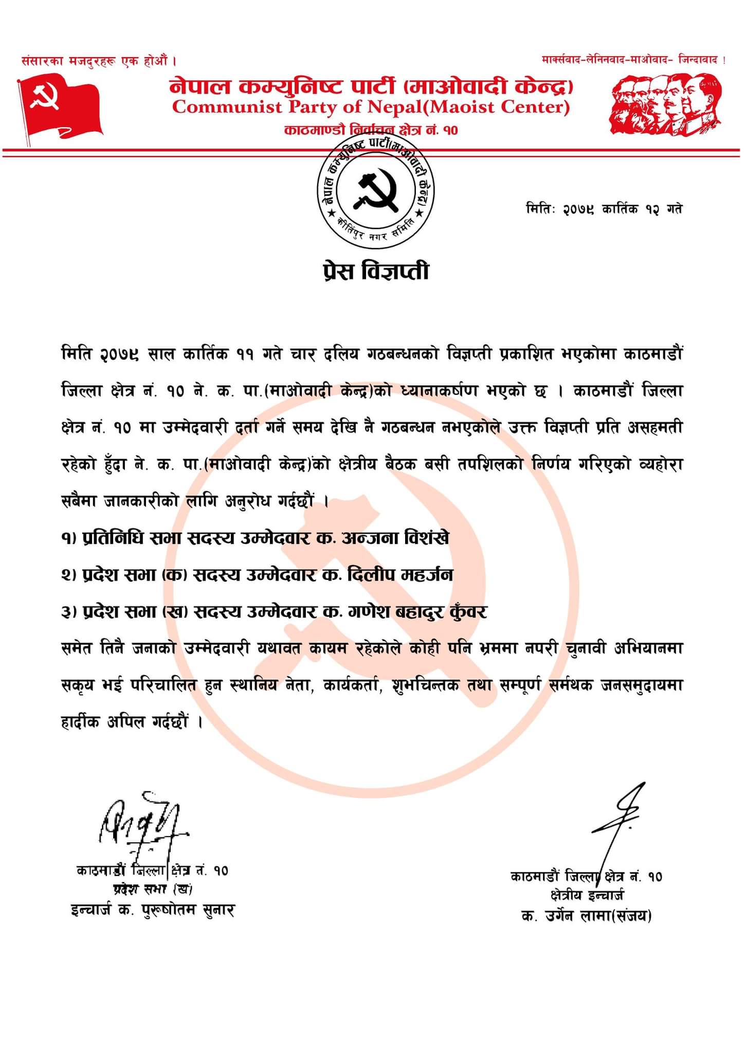 माओवादी केन्द्र काठमाडौं १० ले प्रतिनिधि सभामा अन्जना विशंखे, प्रदेश सभा ‘क’ मा दिलीप महर्जन र ‘ख’ मा गणेश बहादुर कुँवरको उम्मेदवारी कायम रहेको जनाएको छ । तीनै जनाको उम्मेदवारी कायमै रहेकाले भ्रममा नपरी चुनावी अभियानमा लाग्न नेता तथा कार्यकर्तामा अनुरोध गरिएको छ ।