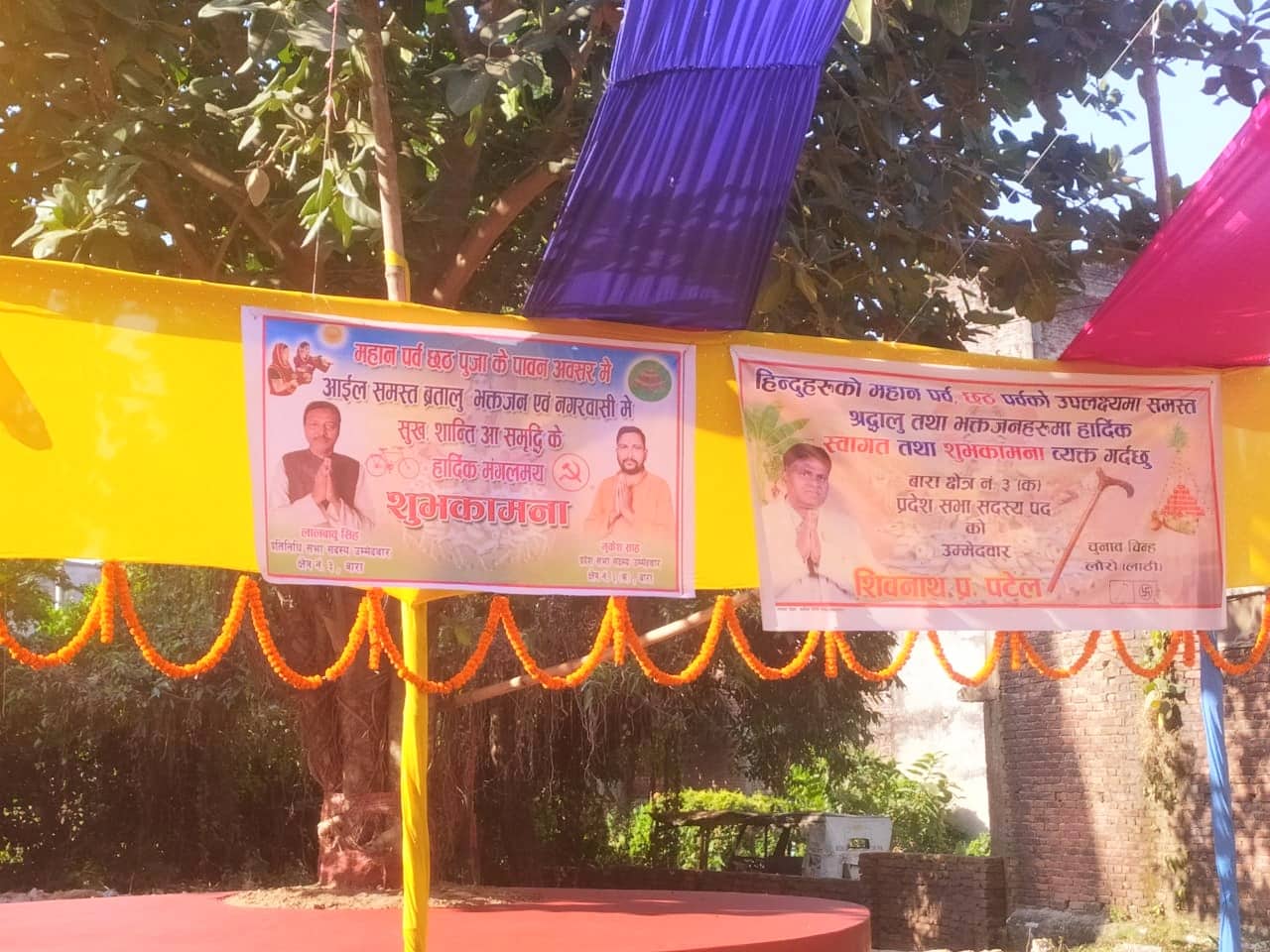 तर, आचारसंहिताविपरीत बारा-३ प्रतिनिधिसभा सदस्य उम्मेदवार लालबाबु सिंह, प्रदेशसभा ३(१) का उम्मेदवार मुकेश साह, हाम्रो नेपाली पार्टीका प्रदेशसभा ३(१) का उम्मेदवार शिवनाथ पटेल, नेपाल लोकतान्त्रिक पार्टीबाट प्रतिनिधिसभाका समानुपातिक उम्मेदवार बृजकिशोर साहले आफ्नो फोटो, नाम र चुनाव चिह्नसहित छठ घाटमा ब्यानर लगाएका हुन् ।