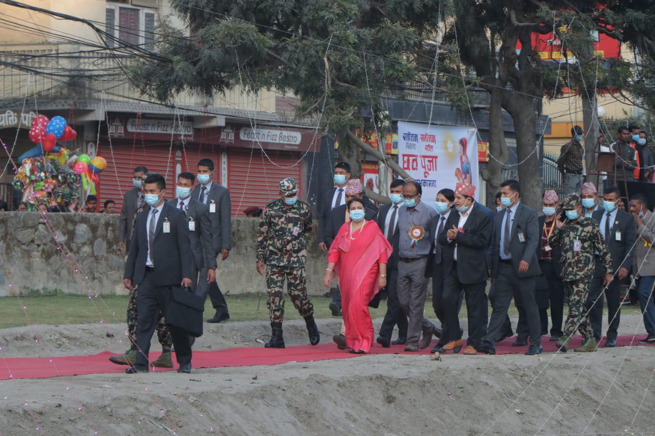 देशका विभिन्न भागमा भव्यरूपमा मनाइने छठ पर्वका अवसरमा राष्ट्रपतिले प्रत्येक वर्ष गुह्येश्वरी र कमलपोखरीमा सूर्यदेवसहित छठी माताको पूजा आराधना गरी अस्ताउँदो सूर्यलाई अर्घ्य दिने परम्परा छ । छठ पर्वका अवसरमा आज अस्ताउँदो सूर्यलाई पूजा आराधना गरी अर्घ्य दिन राजधानीका अन्य स्थानका साथै यहाँको छठ घाट पनि सजाइएको थियो ।