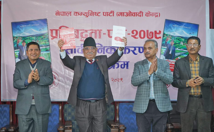 काठमाडौं । नेकपा माओवादी केन्द्रले आगामी मंसिर ४ गते हुने प्रतिनिधिसभा र प्रदेशसभा निर्वाचनका लागी आफ्नो प्रतिबद्धतापत्र जारी गरेको छ । माओवादी अध्यक्ष पुष्पकमल दाहालले सोमबार प्रतिबद्धतापत्र जारी गरेका हुन् ।
