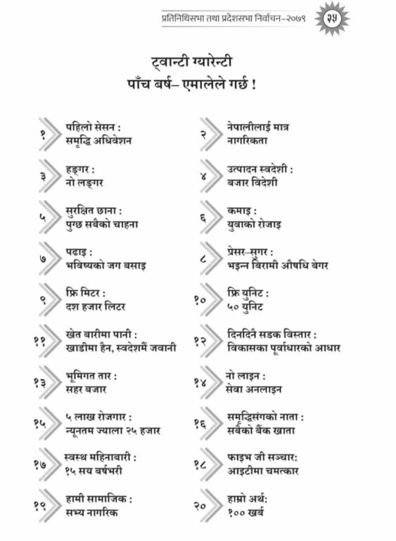 काठमाडौं । एमालेले २० ग्यारेन्टीसहितको चुनावी घोषणापत्र सार्वजनिक गरेको छ । जसमा ‘पाँच वर्षः एमालेले गर्छ’ भनेर नारा अघि सारिएको छ ।