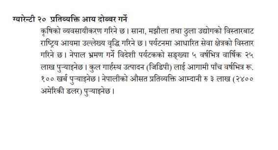 त्यस्तै आगामी ५ वर्षभित्र प्रतिव्यक्ति आय ३ लाख (२४०० अमेरिकी डलर) पुर्याउने समेत उल्लेख गरिएको छ ।