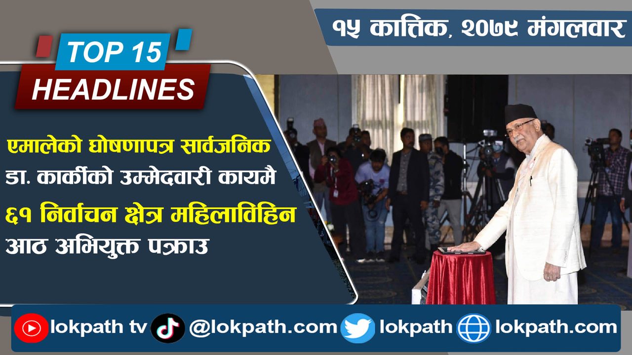१. आगामी प्रतिनिधि र प्रदेश सभा निर्वाचनका लागि नेकपा एमालेले सार्वजनिक गर्यो घोषणापत्र, ‘समृद्ध नेपाल सुखी नेपाली’ लाई निरन्तरता दिने, ५ वर्षमा जिडिपी १०० खर्ब पुर्याउनेदेखि सेनिटरी प्याड किन्न १ हजार ५ सय दिनेसम्मका एजेण्डा ।