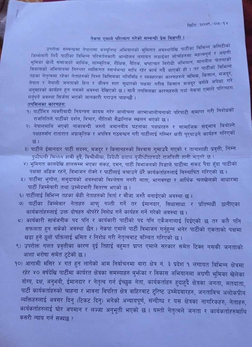 निर्वाचनको मुखमा रातारात जनता समाजवादी पार्टीसँगको अप्राकृतिक गठबन्धनको कारण बाध्य भएर पार्टीबाट सामूहिक राजीनामा दिनुपरेको बताएका छन् । उनीहरूले पार्टीबाट राजीनामा दिनुको १० वटा कारणहरू विज्ञप्तिमा उल्लेख गरेका छन् । जसमध्ये बारा–३ नं क्षेत्रमा पार्टीभित्र योग्य, इमानदार नेतृत्व गर्न इच्छुक नेता कार्यकर्ता हुदाँहुदै कार्यकर्ताको भावना विपरीत जनतामाझ अलोकप्रिय व्यक्तिलाई टिकट दिनु गलत र लज्जास्पद कार्य भएको उल्लेख छ ।