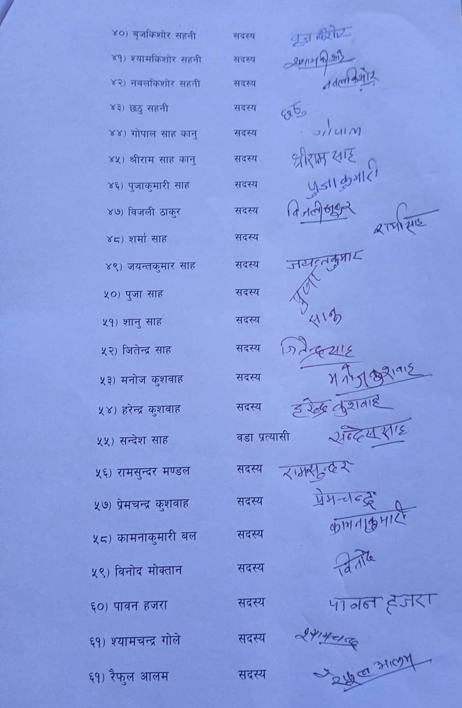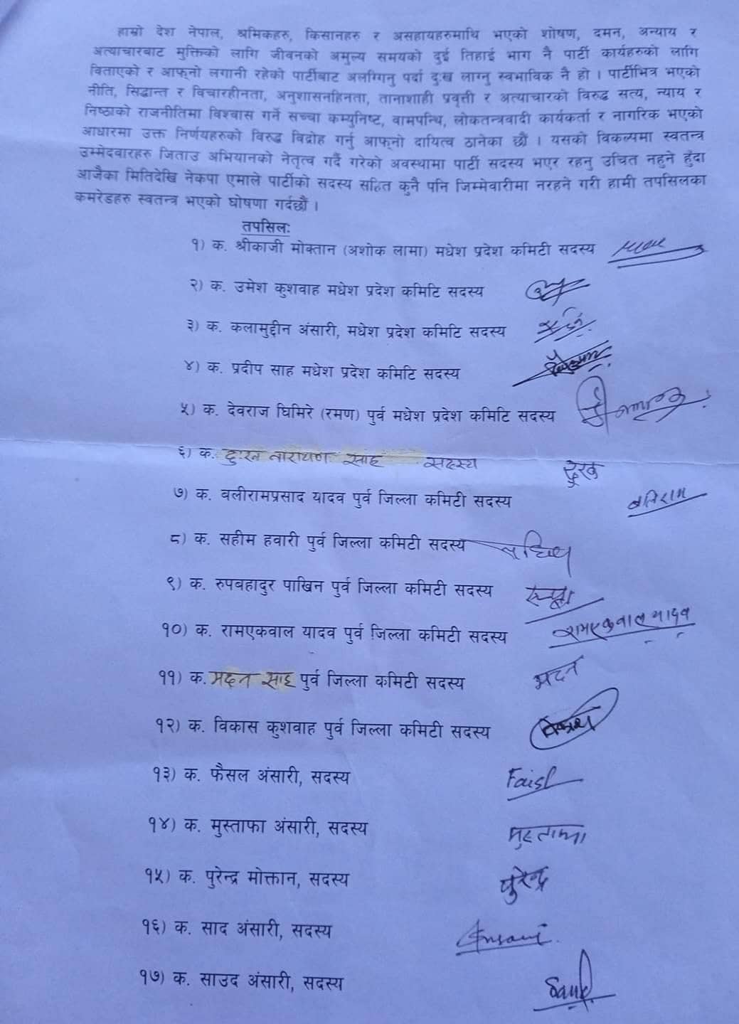 साथै सामूहिक राजीनामा दिनेहरूमा फैसल अन्सारी, मुस्ताफा अन्सारी, पुरेन्द्र मोक्त्तान, साद अन्सारी, साउद अन्सारी,सलाउद्दीन अन्सारी, अब्दुल्लाह अजाद, अब्बाद अन्सारी, अम्मार अन्सारी, किसान संघ जिल्ला कमिटी सदस्य जादोलाल गोठ, अनेरास्ववियु जिल्ला कमिटी सदस्य राकेश वैठा, दलित जिल्ला कमिटी सदस्य राम भरोस राम सहित ७६ जनाले विज्ञप्ति नै जारी गरेर सामूहिक राजीनामा दिएका हुन् ।