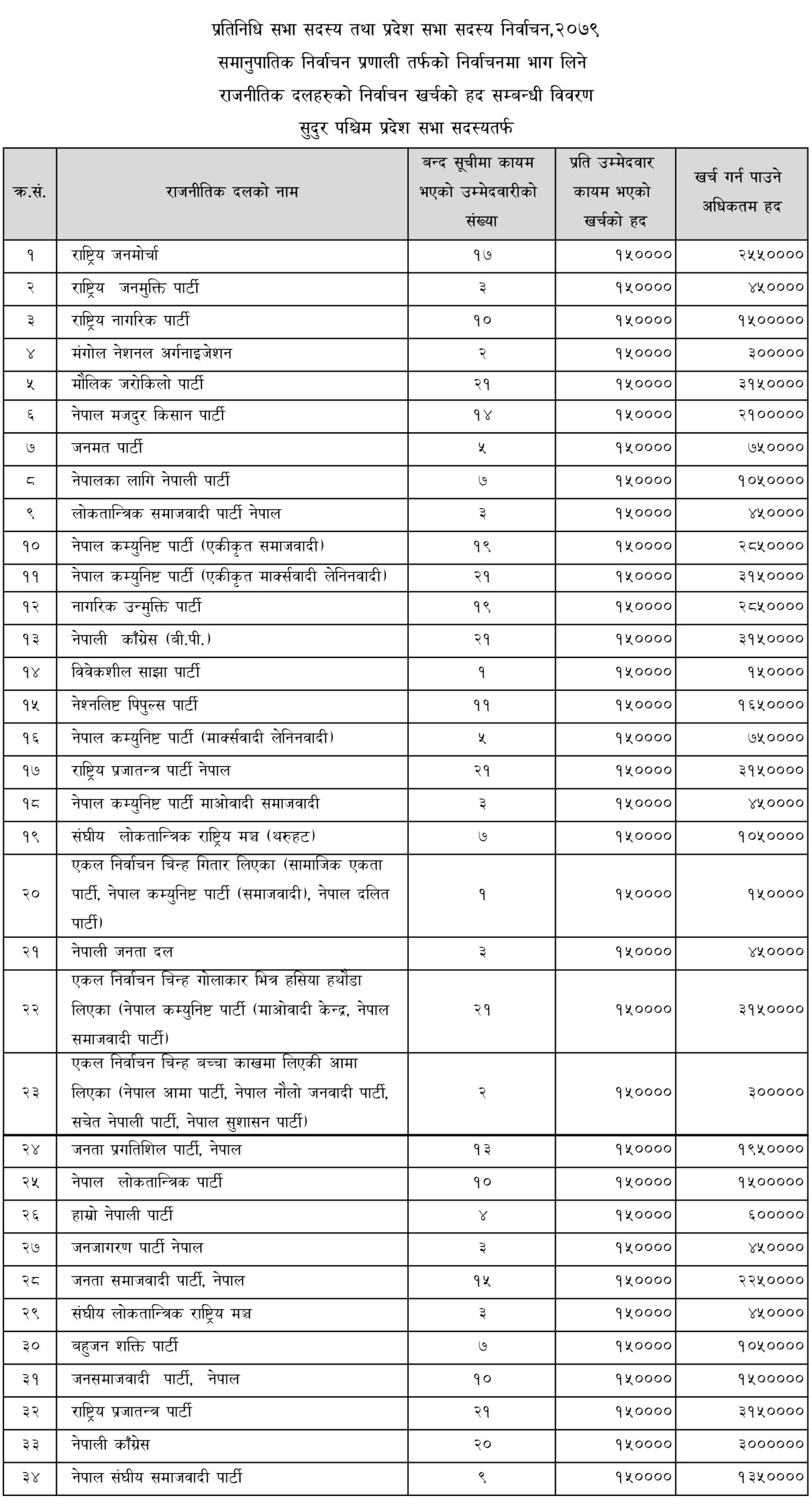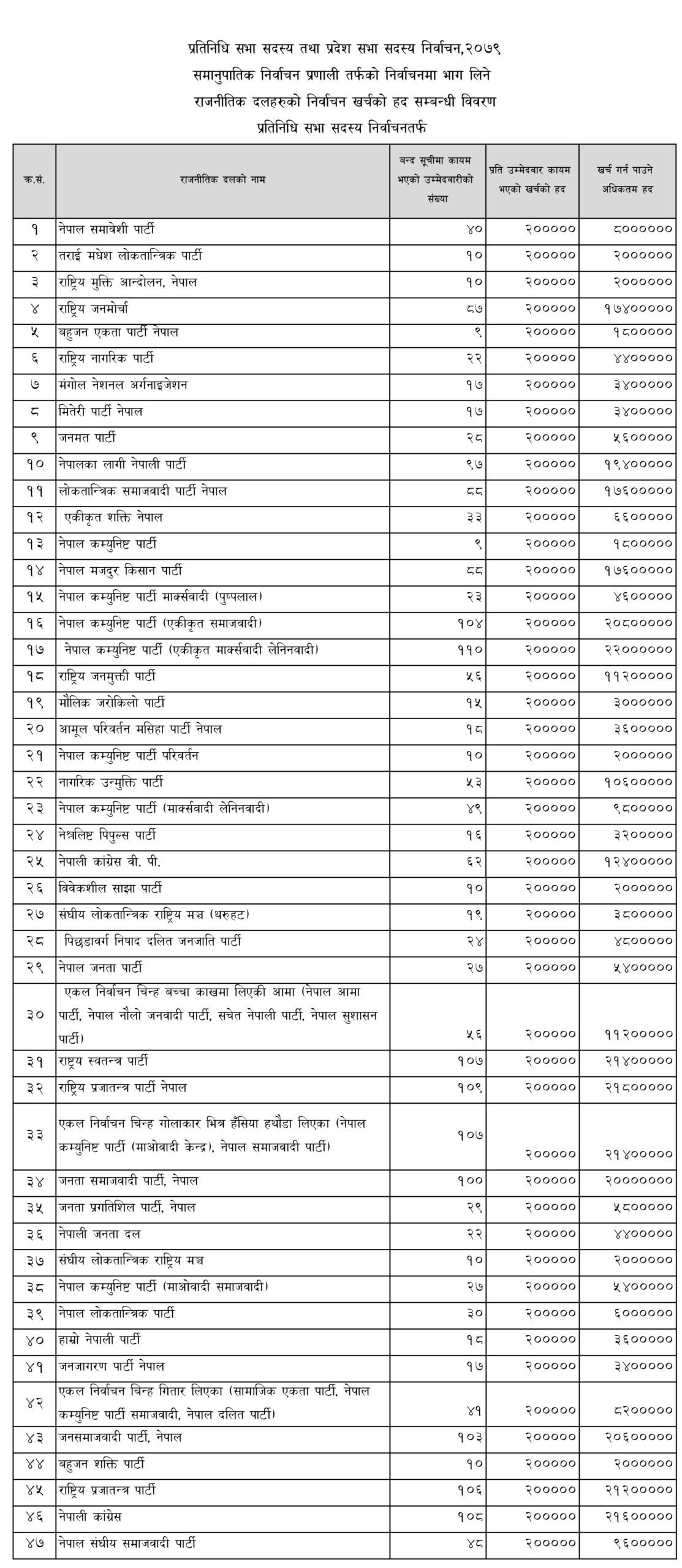 राजनीतिक दलले निर्वाचन सम्बन्धी खर्च गर्दा दलको तर्फबाट खर्च गर्ने जिम्मेवार पदाधिकारी तोकी निजको नाम नामेसी सहितको विवरण १० दिनभित्र आयोगमा पठाउनु पर्ने निर्णय पनि आयोगले गरेको छ । आयोगका अनुसार प्रतिनिधिसभातर्फ समानुपातिकमा ४७ दलले भाग लिएका छन् । यस्तै प्रदेशसभातर्फ प्रदेश १ मा ३६, मधेस प्रदेशमा ३६, बागमती प्रदेशमा ४२, गण्डकी प्रदेशमा ३१, लुम्बिनी प्रदेशमा ३२, कर्णाली प्रदेशमा २८ र सुदूरपश्चिम प्रदेशमा ३४ दलले भाग लिएका छन् ।