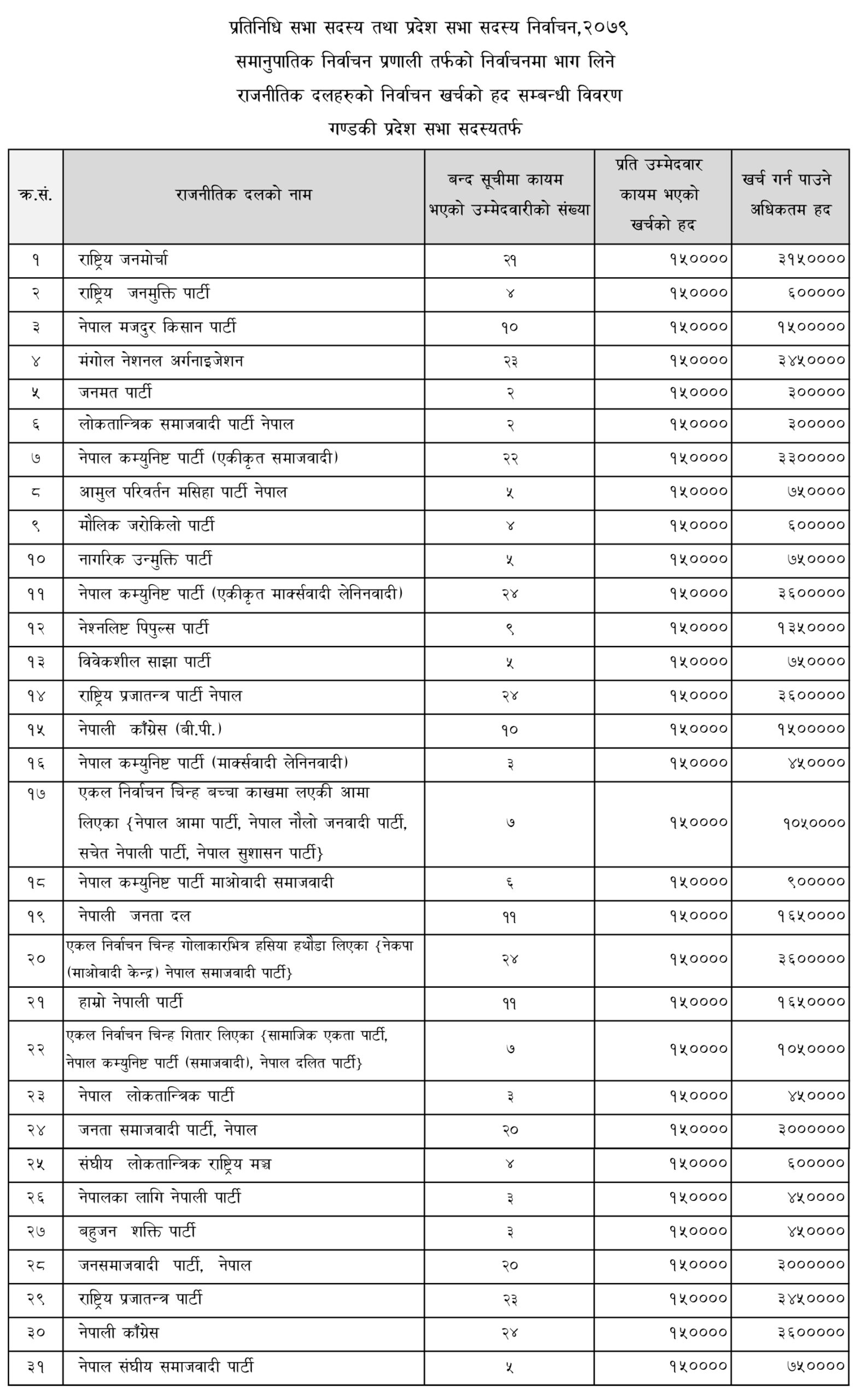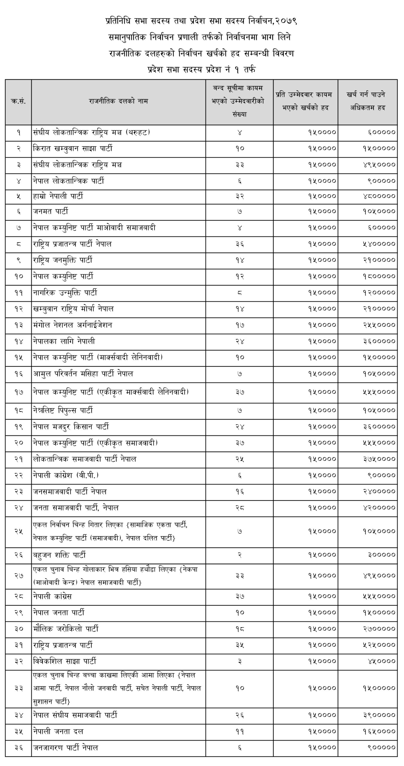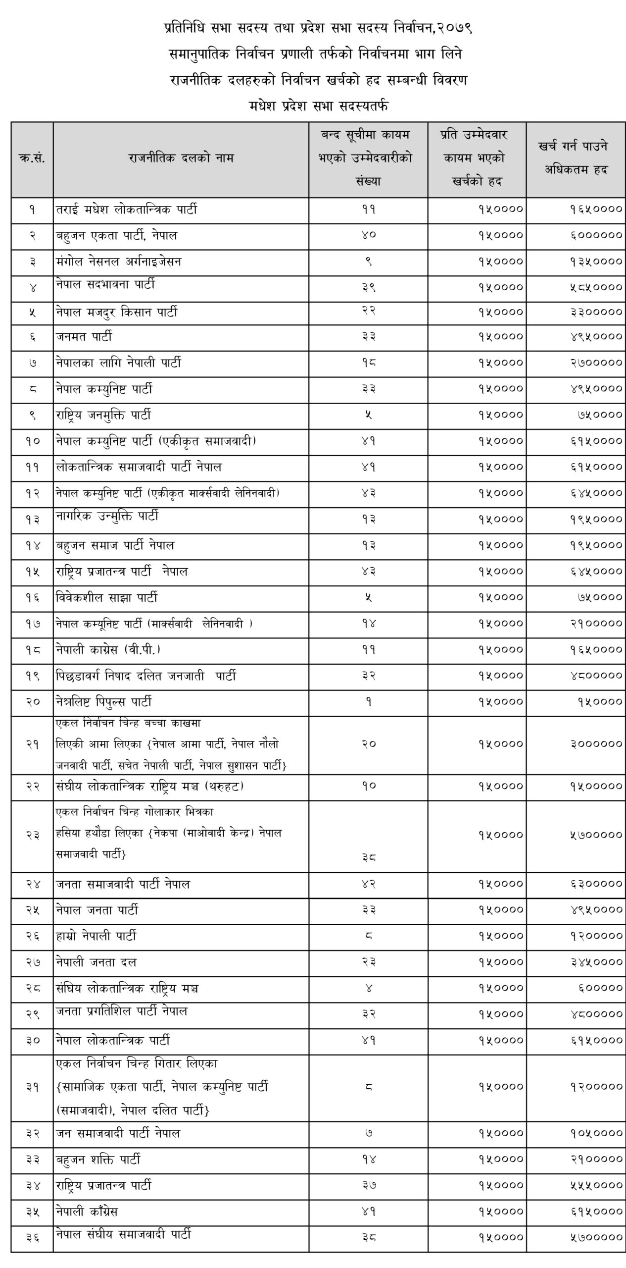 काठमाडौं । निर्वाचन आयोगले प्रतिनिधि सभा तथा प्रदेश सभा सदस्य निर्वाचन, २०७९ मा समानुपातिक निर्वाचन प्रणालीतर्फ दलले खर्च गर्न पाउने रकमको सीमा तोकेको छ । समानुपातिक निर्वाचन प्रणालीतर्फ उम्मेदवारको बन्दसूची पेस गर्ने राजनीतिक दललाई बन्दसूचीमा कायम भएको उम्मेदवारको संख्याको आधारमा निर्वाचन खर्चको अधिकतम हद कायम गरिएको हो ।