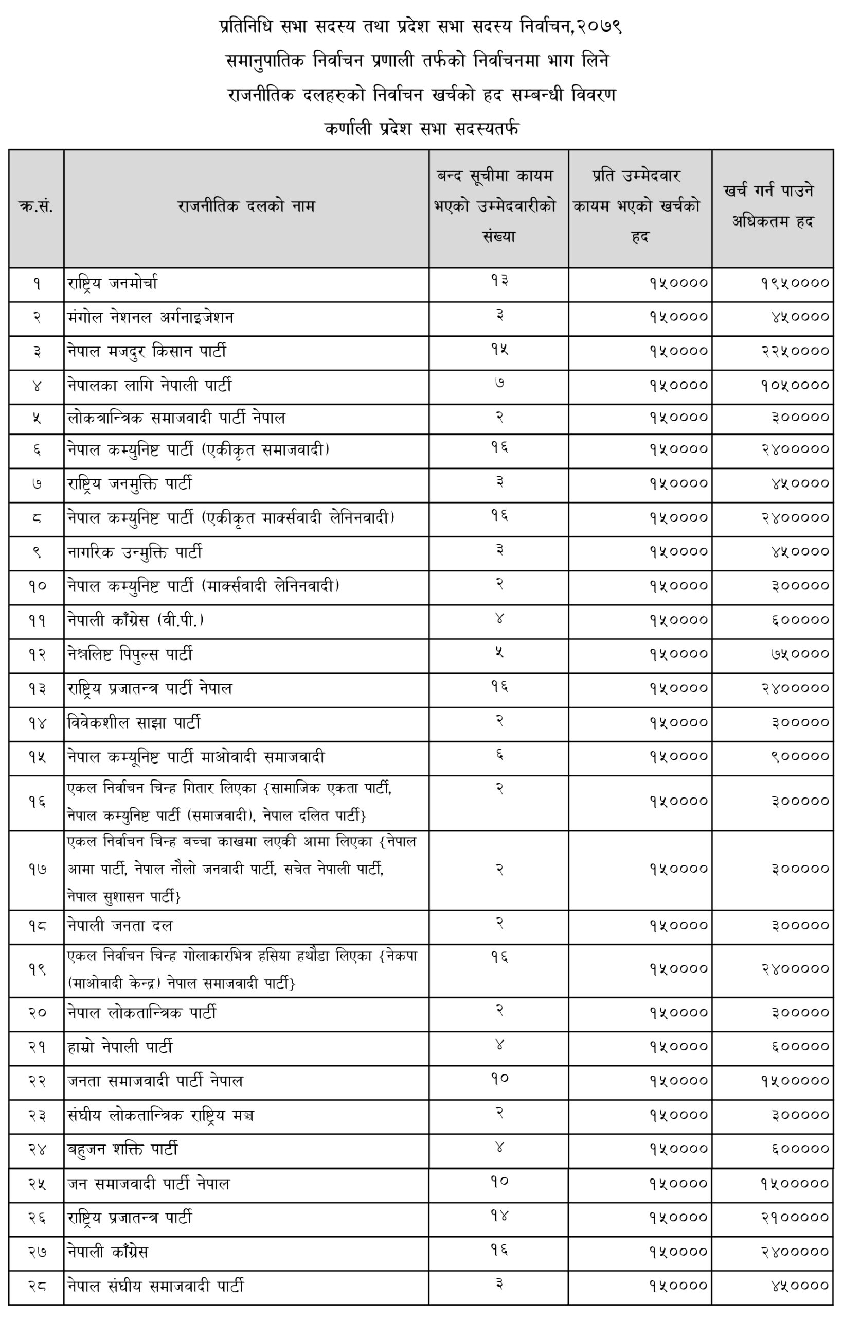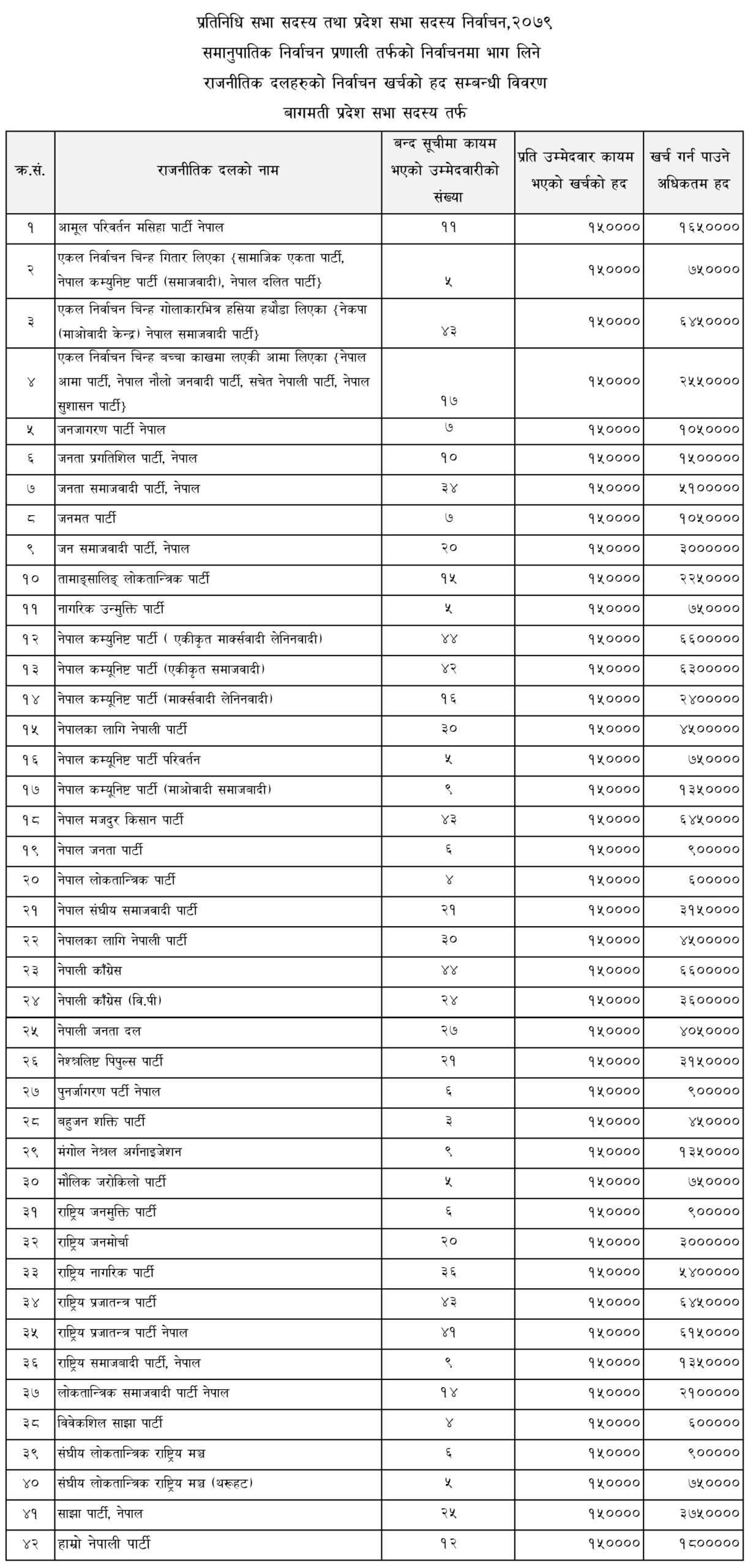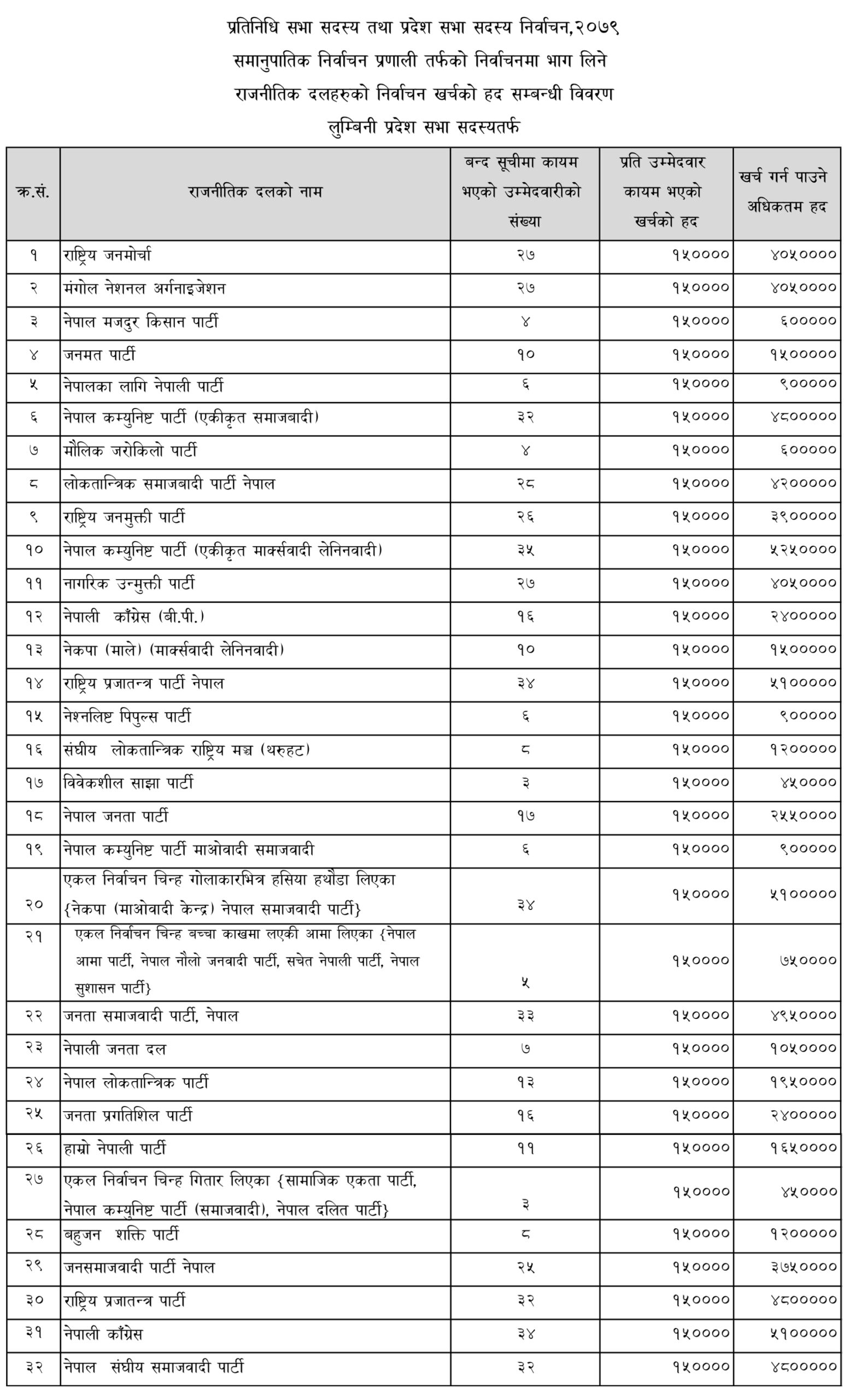 काठमाडौं । निर्वाचन आयोगले प्रतिनिधि सभा तथा प्रदेश सभा सदस्य निर्वाचन, २०७९ मा समानुपातिक निर्वाचन प्रणालीतर्फ दलले खर्च गर्न पाउने रकमको सीमा तोकेको छ । समानुपातिक निर्वाचन प्रणालीतर्फ उम्मेदवारको बन्दसूची पेस गर्ने राजनीतिक दललाई बन्दसूचीमा कायम भएको उम्मेदवारको संख्याको आधारमा निर्वाचन खर्चको अधिकतम हद कायम गरिएको हो ।