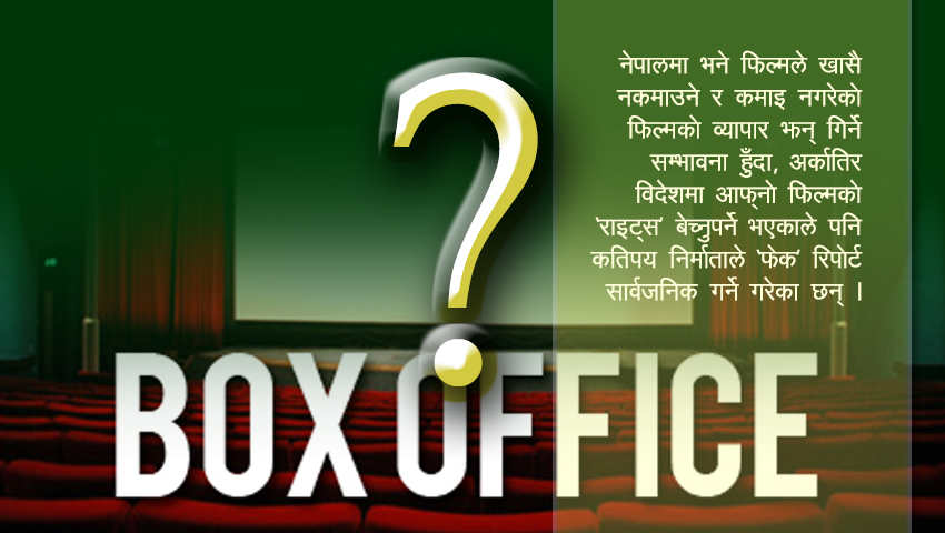 नेपालमा भने फिल्मले खासै नकमाउने र कमाइ नगरेको फिल्मको व्यापार झन् गिर्ने सम्भावना हुँदा र विदेशमा आफ्नो फिल्मको राइट्स बेच्नुपर्ने भएकाले पनि कतिपयले निर्माताले ‘फेक’ रिपोर्ट सार्वजनिक गर्ने गरेका छन् ।