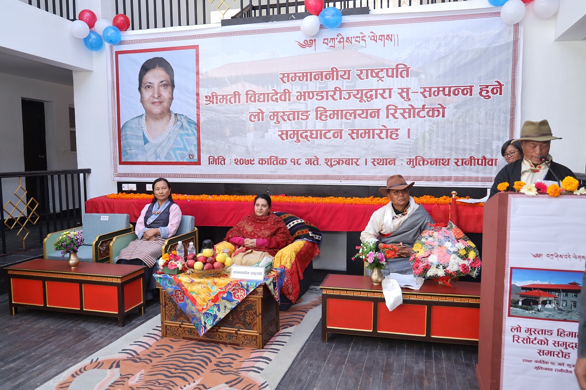 काठमाडौं । राष्ट्रपति विद्यादेवी भण्डारीले मुस्ताङमा रहेको प्रशिद्ध तिर्थस्थस्ल मुक्तिनाथ क्षेत्रमा ‘लो मुस्ताङ हिमालयन रिसोर्ट’ उद्घाटन गरेकी छन् । गैर आवासीय नेपाली संघका पूर्व उपाध्यक्ष सोनाम लामाको व्यक्तिगत लगानीमा मुक्तिनाथ क्षेत्रको विकासका लागि करोडौंको लगानीमा निर्माण भएको धार्मिक र पर्यटकीय पूर्वाधारको राष्ट्रपतिले उद्घाटन गरेकी हुन् ।