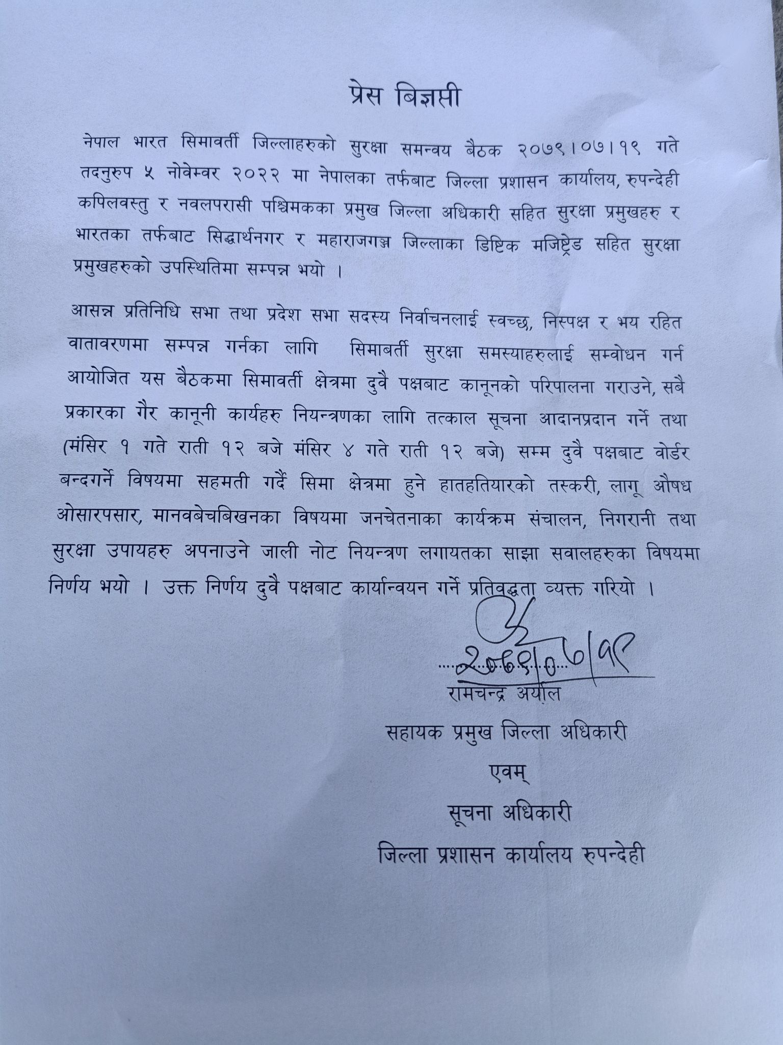 निर्वाचनलाई स्वच्छ, निष्पक्ष र भयरहित वातावरणमा सम्पन्न गर्नका लागि शनिबार नेपालतर्फबाट रुपन्देही, कपिलवस्तु र नवलपरासी पश्चिम तथा भारततर्फबाट सिद्धार्थनगर, महाराजगंजका सुरक्षा अधिकारीहरु बीच भएको बैठकले मंसिर १ गते राति १२ बजेदेखि मंसिर ४ गते राति १२ बजेसम्म दुवै पक्षबाट वोर्डर बन्द (सिल) गर्ने निर्णय गरेको हो ।