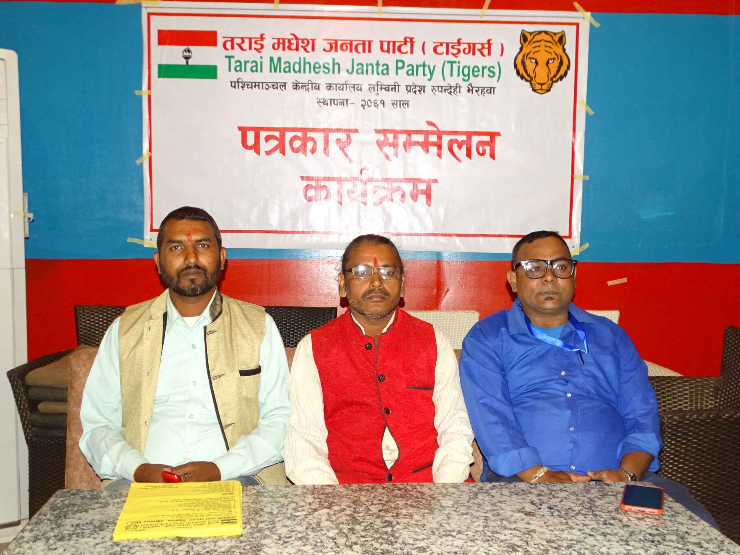 भैरहवा । सरकारले आफूहरूसँग गरेको सम्झौता कार्यान्वयन नगरेको भन्दै तराई मधेस जनता पार्टी (टाइगर्स)ले प्रतिनिधिसभा र प्रदेशसभा निर्वाचन बहिष्कार गरेको छ । भैरहवामा मंगलबार पत्रकार सम्मेलन आयोजना गर्दै ०७५ सालमा सरकारसँग भएको ११ बुँदे सम्झौता अझै कार्यान्वयन नभएको, तराई मधेसका मुद्दाहरू यथावत रहेको, मधेशवादी दलले पनि मधेशका मुद्दा बिर्सेर व्यक्तिगत स्वार्थमा लिप्त भएको उसले आरोप लगाएको छ ।