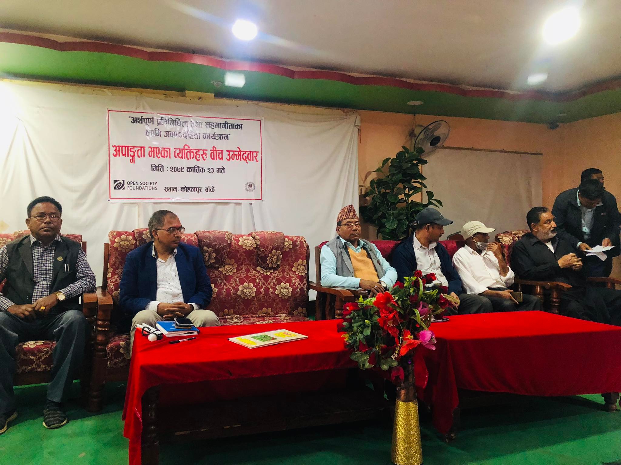 कोहलपुर । मंसिर ४ गते हुने प्रतिनिधि र प्रदेशसभा सदस्य पदका उम्मेदवारहरुले बाँकेमा अपांगता भएका व्यक्तिहरुको अधिकारलाई स्थापित गर्ने सवालमा प्रतिबद्धता जनाएका छन् । अपांग सशक्तिकरण तथा संचार केन्द्र डेक नेपालको आयोजना तथा ओपन सोसाइटी फाउण्डेसनको सहयोगमा बाँकेको कोहलपुरमा बुधवार भएको अर्थपूर्ण प्रतिनिधित्व तथा सहभागिताका लागि जवाफदेहिता कार्यक्रम अन्तर्गत ‘अपांगता भएका व्यक्तिहरुबीच उम्मेदवार’ कार्यक्रममा सहभागि भएका प्रतिनिधिसभा र प्रदेशसभाका उम्मेदवारहरुले आफ्नो चुनावी एजेण्डामा अपांगता भएका व्यक्तिहरुको सवाललाई पनि प्राथमिकता दिएको बताए ।