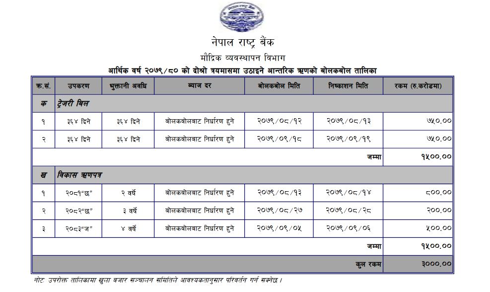 मंसिर १२ गते तीन सय ६४ दिने अवधिको सात अर्ब ५० करोड रुपैयाँको ट्रेजरी बिल बिक्री हुने छ भने मंसिर १८ गते पुन तीन सय ६४ दिने अवधिको सात अर्ब ५० करोड रुपैयाँ बराबरको ट्रेजरी बिल बिक्री हुने छ । विकास ऋणपत्र तर्फ भने यही मंसिर १३ गते दुई बर्षे अवधिको विकास ऋणपत्र २०८१ “छ” राष्ट्र बैंकका अनुुसार उक्त ऋणपत्र आठ अर्ब रुपैयाँ बराबरको रहेको छ । यसैगरी मंसिर १३ गते पनि दुई अर्ब रुपैयाँ बराबरको विकास ऋणपत्र २०८२ “छ” बिक्री हुने छ ।