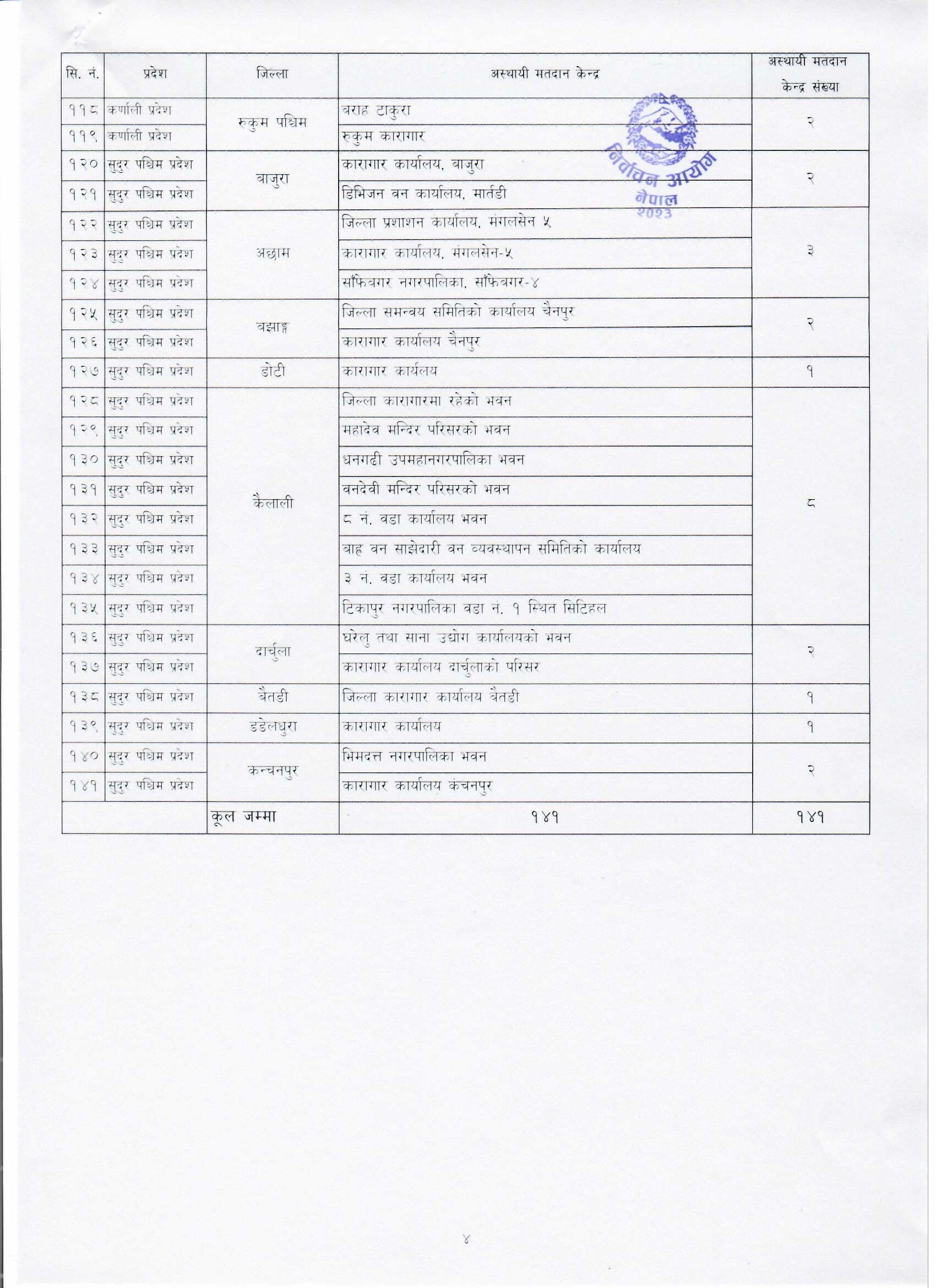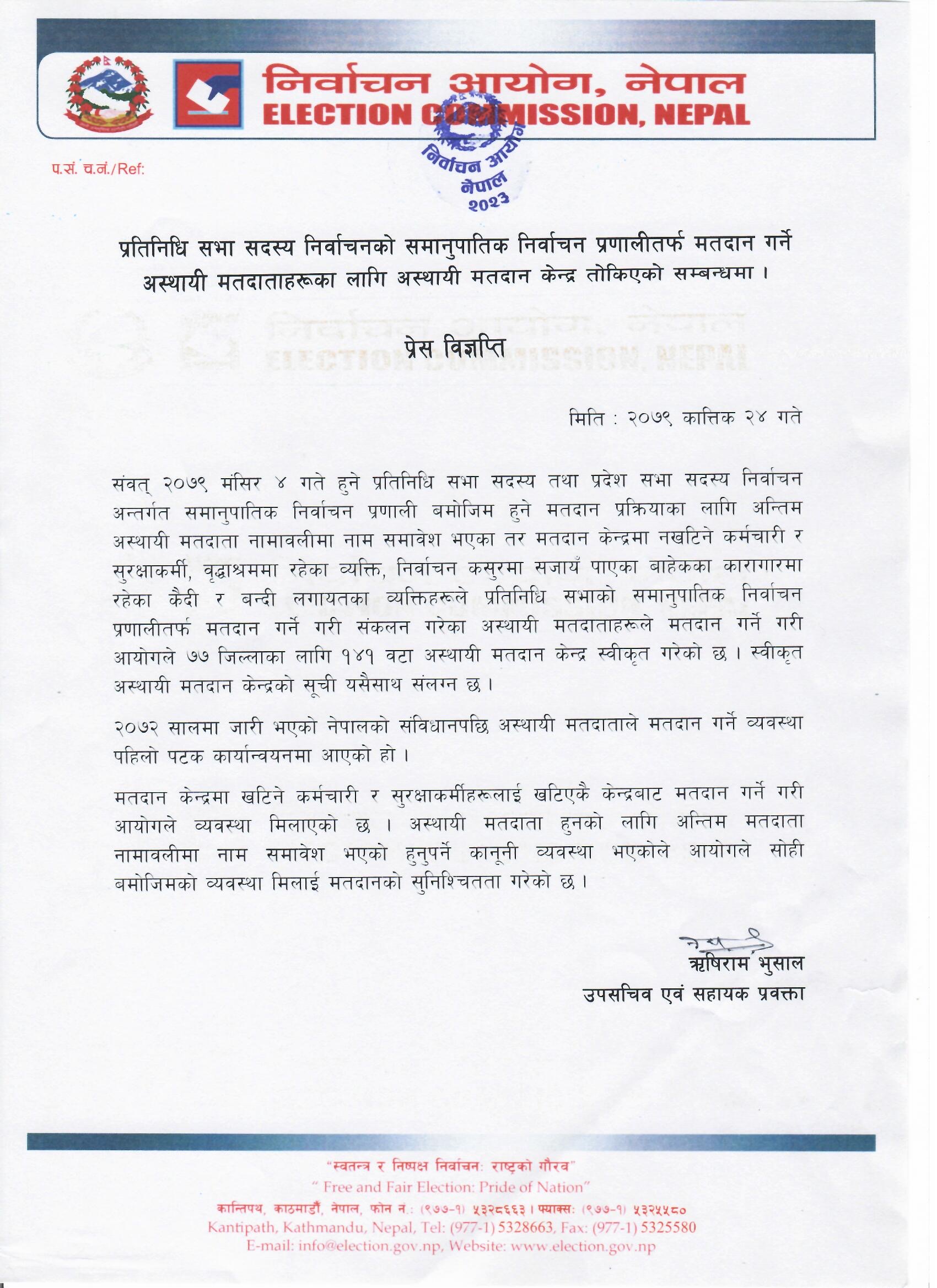 आयोगका अनुसार अस्थायी मतदाता नामावलीमा नाम भएका तर मतदान केन्द्रमा नखटिने कर्मचारी, सुरक्षाकर्मी, वृद्धाश्रममा रहेका व्यक्ति, निर्वाचन कसुरमा सजाय पाएका बाहेक अन्य कैदी बन्दीलगायतका लागि अस्थायी मतदान केन्द्र कायम गरेको हो । आयोगले ७७ जिल्लामा १४१ वटा अस्थायी मतदान केन्द्र स्वीकृत गरेको छ ।